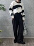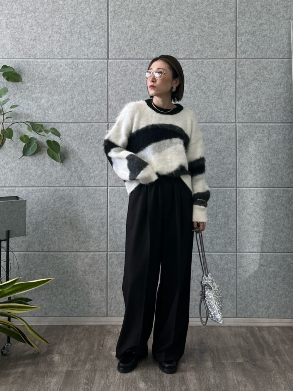 【サイズ感】 トップス:ややゆったり ボトムス:標準 【着用レビュー】 柄のコントラストが効いた、もけもけシャギーニット。 チクチク感は気にならなかったです。 長めな袖と絶妙なゆるさで、着るだけでオシャレに見えます。 パンツは裏地がついて冬にも対応できるように! シルエットのきれいさは健在です。