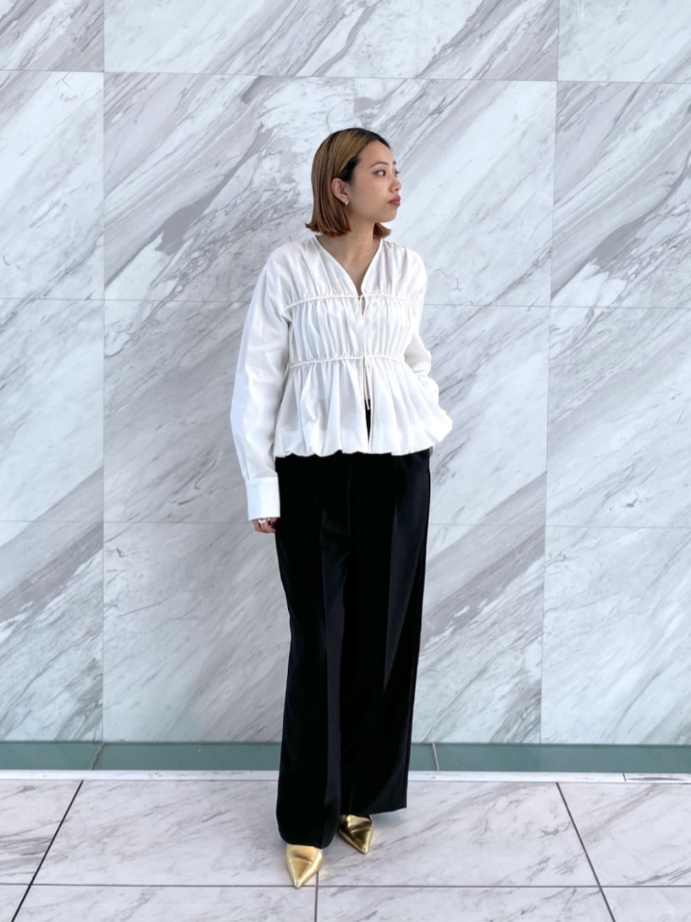 Tops:シャーリングデザインがポイントのブラウスは、さらっと着られて羽織りにもおすすめ◎着丈も長すぎず、ボトムスとのバランスもとりやすいです!春の着映えトップスにおすすめの1着です❤︎ Pants:ウエストゴムなのにキレイに決まるイージーパンツは、オンオフおすすめの1着◎しわになりにくく、さらっとしているので取り扱いもラクチン◎キレイめなアイテムにもカジュアルなアイテムにもマッチし、履き心地・着回しやすさ抜群なので、GALLESTスタッフもつい色違いで購入してしまう万能パンツです❤︎