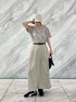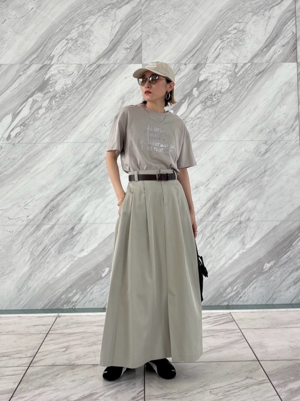 【サイズ感】 トップス:標準 ボトムス:標準 【着用レビュー】 Tシャツを大人っぽくワントーンでまとめたコーデ♪ 文字がシルバーなのがお洒落でカジュアルすぎなくていい! トレンド感たっぷりのフレアチノスカートは、穿くだけで今っぽいスタイルに。 ハリがあるので体型カバーにも♪