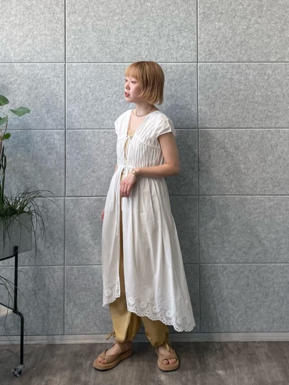 ・one-piece/裾のレースがかわいいワンピース。 羽織タイプなので着方で雰囲気を変えられるアイテムです。 夏はショートパンツを合わせるのもおすすめです。 ・pants/サラリとした素材でラクちんパンツ。 裾の絞りデザインがポイントになっていて、マスタードのカラーがスポーティになりすぎず◎。