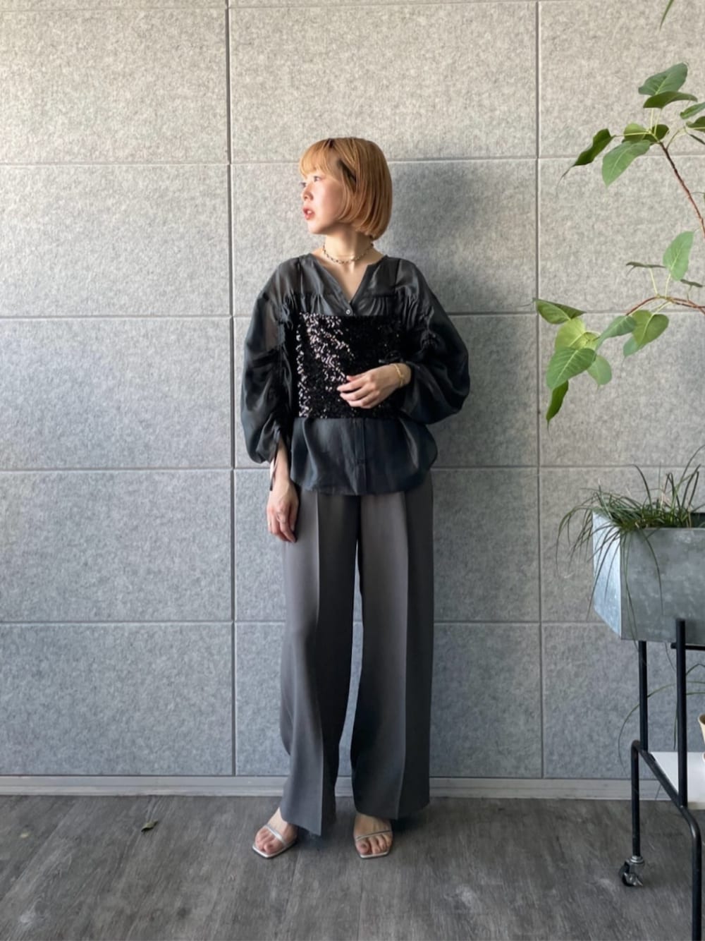 ・blouse/店頭でも大人気のブラウス。 シアー素材、袖のシャーリング、スキッパー襟がポイントです。 袖のシャーリングは調整可能なので絞って短い袖で着たり、伸ばして長袖でも着れます! スキッパー襟が大人っぽく女性らしいデザイン。 ・bustier/スパンコールのギャレストらしいアイテム。 使い方様々で、一点投入でおしゃれ格上スタイルに。 ・pants/GALLESTメンバーもみんな数本は持っている名品パンツ。 ウエストゴムで履きやすいのに美脚に見せてくれます。 一度は履いてみてほしいです!