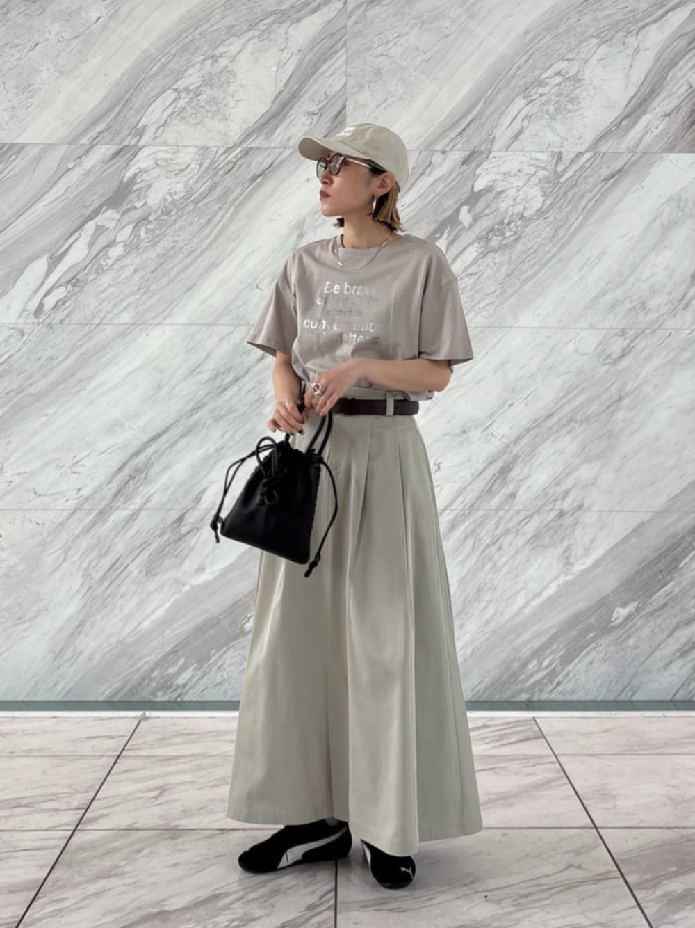 Tシャツは文字がシルバーなのがお洒落でカジュアルすぎず◎。 トレンド感たっぷりのフレアチノスカートは、穿くだけで今っぽいスタイルに。 ハリがあるので体型カバーにも♪