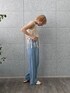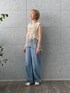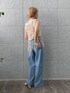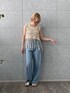 シャイニーなベアトップにクロシェ編みのビスチェをレイヤード。 デニムはとても軽くて夏でもストレスなく着用できます。