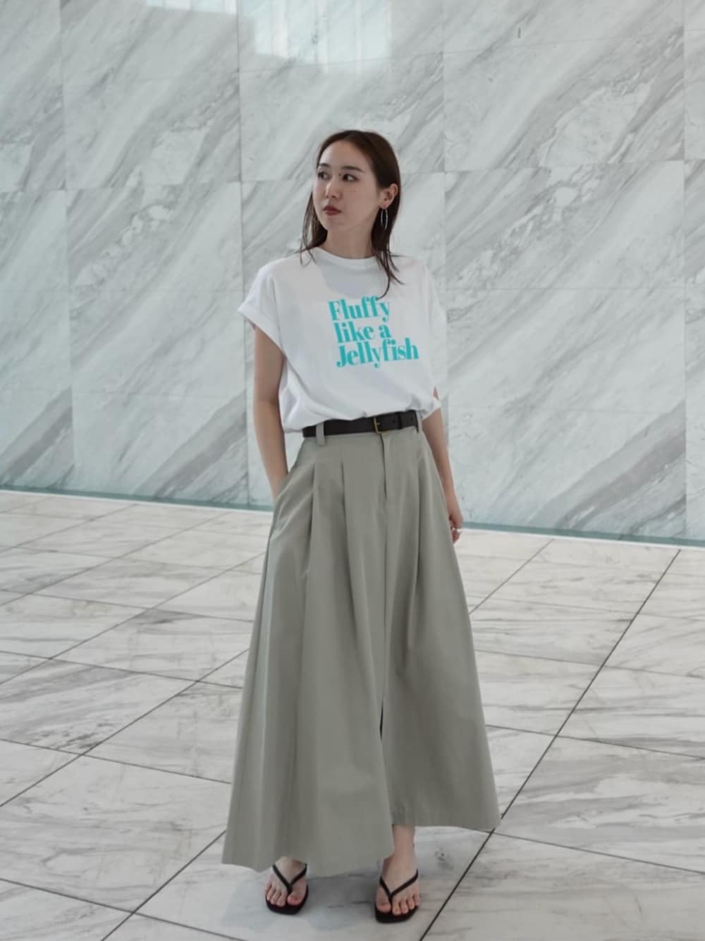 シンプルなスタイリングですが、ベルトでしっかり引き締めるとまとまります◎ チノスカートはシルエットがとても綺麗でした! 1枚でさまになるデザインとカラーです♪