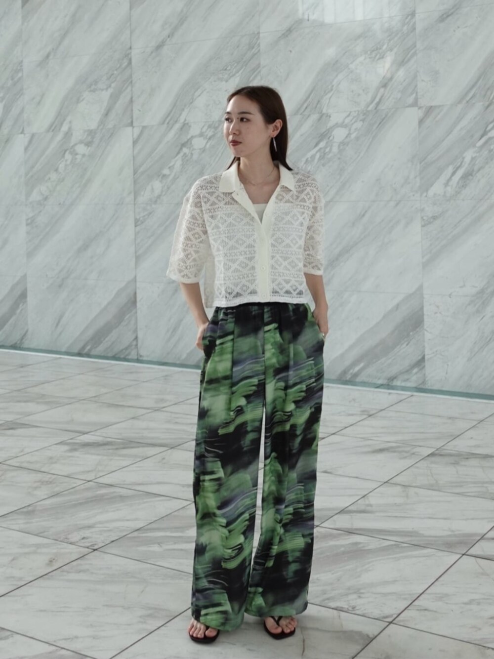 レースアイテムをすこし柄の効いたアイテムと合わせるのが◎ パンツはウエストがゴムですごく楽です! 夏でも快適に履けるサラサラ素材でした☆