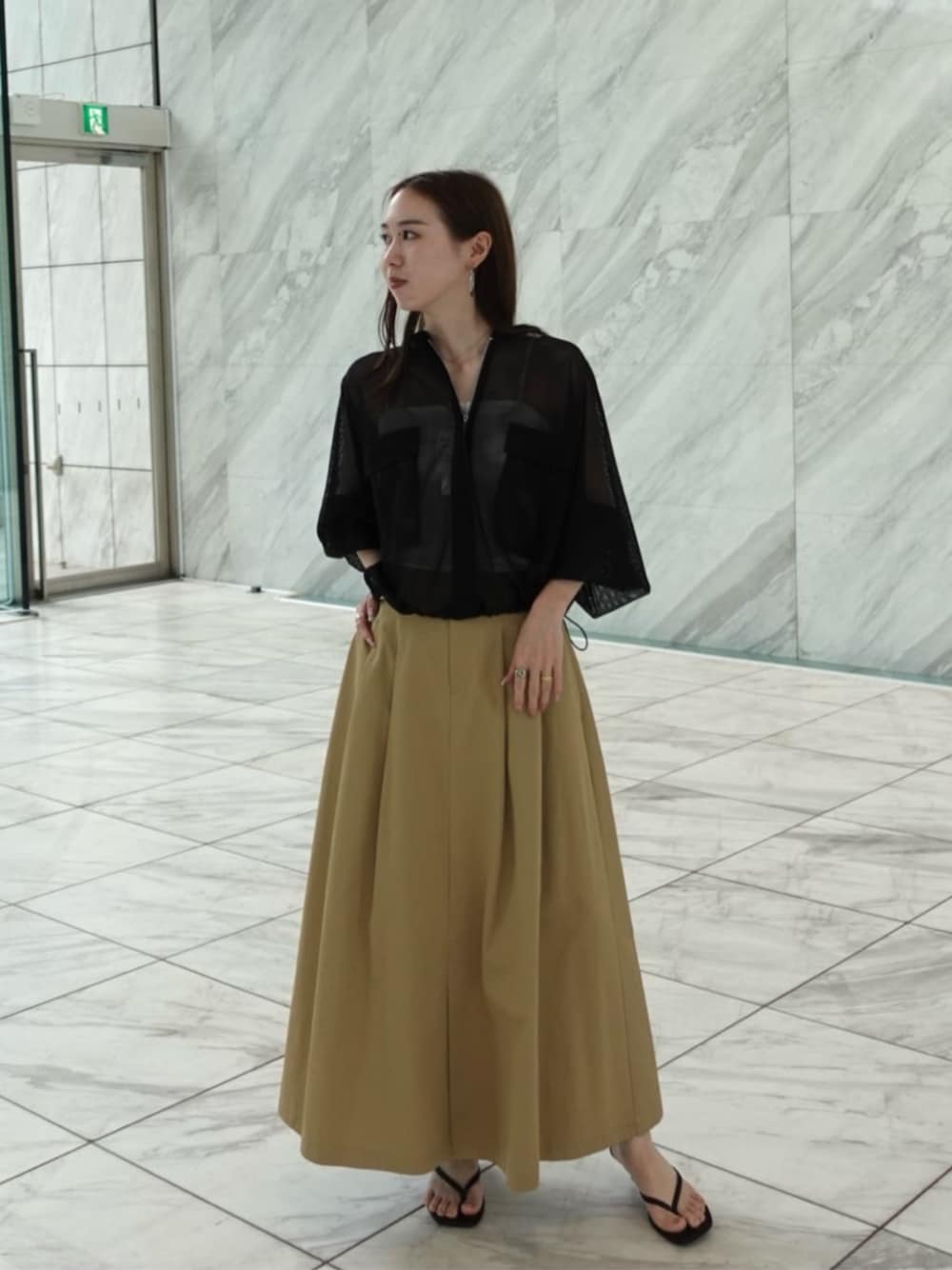 毎年好評のメッシュブルゾン! トップスとして着たり、羽織にしたりといろいろ着回し可能です! プラスするだけでモードな雰囲気がグッと増します◎ チノスカートはハリがあり生地でシルエットがとても綺麗でした。