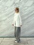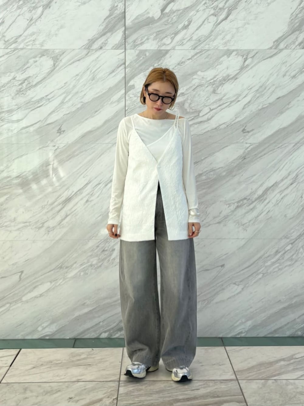 シンプルなリブカットソーにキャミジレを重ねたコーデ。 奥行きが出て洒落感がアップします。 お腹周りのカバーにもなるので、ぴたっとしたボトムに合わせるのも◎です!
