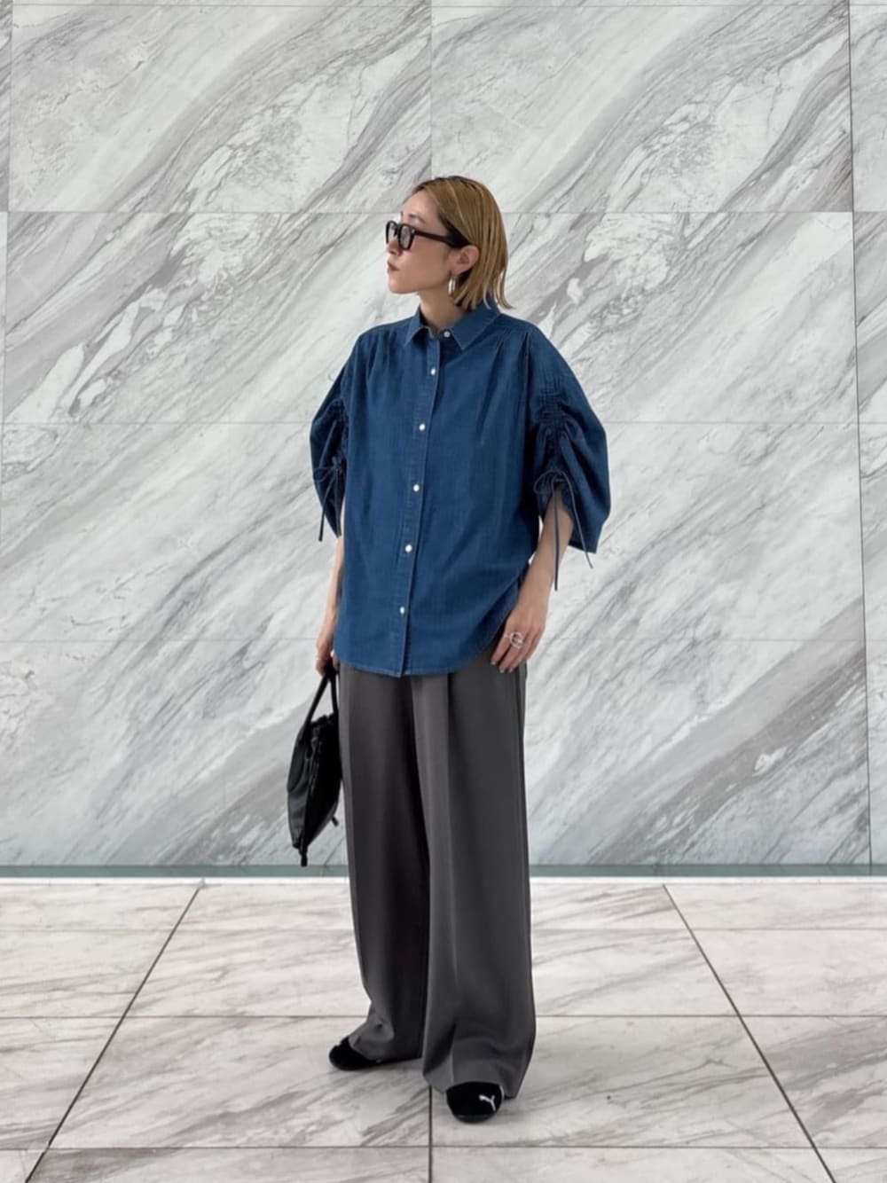 袖デザインが目を引くデニムシャツ。 デニムのごわつきはなく、薄手で柔らかく着やすいです。 肘の隠れる袖丈で、軽めの羽織で使えるのもいいです。