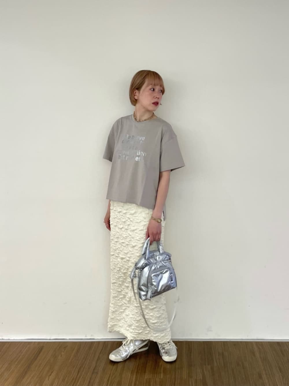 ⚪︎T shirt/シンプルなロゴとオーバーサイズすぎず、ほどよく身体が泳ぐサイジングで大人っぽく着れる! グレージュのカラーは店頭でも大人気です。 ⚪︎skirt/フクレジャージの素材感がポイントのスカート。 ウエストはゴムなのと、生地全体が伸びの良いジャージ素材なので、タイトシルエットでも動きやすくて履きやすいです! 長さは長めで地面スレスレで履くのがオススメですよ😊