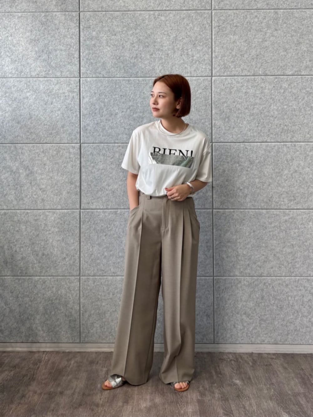 【トップス】 箔プリントがトレンド感のあるアイテム。 程よくゆったりしたサイジングでパンツでもスカートでも相性◎。 【パンツ】 前後のセンタープレスで足のラインを綺麗に見せてくれます。 ベルトのデザインがポイントなので、ウエストはインスタイルがおすすめ。 ブラウスやミュールと合わせるればオフィスコーデにも使えます。