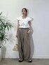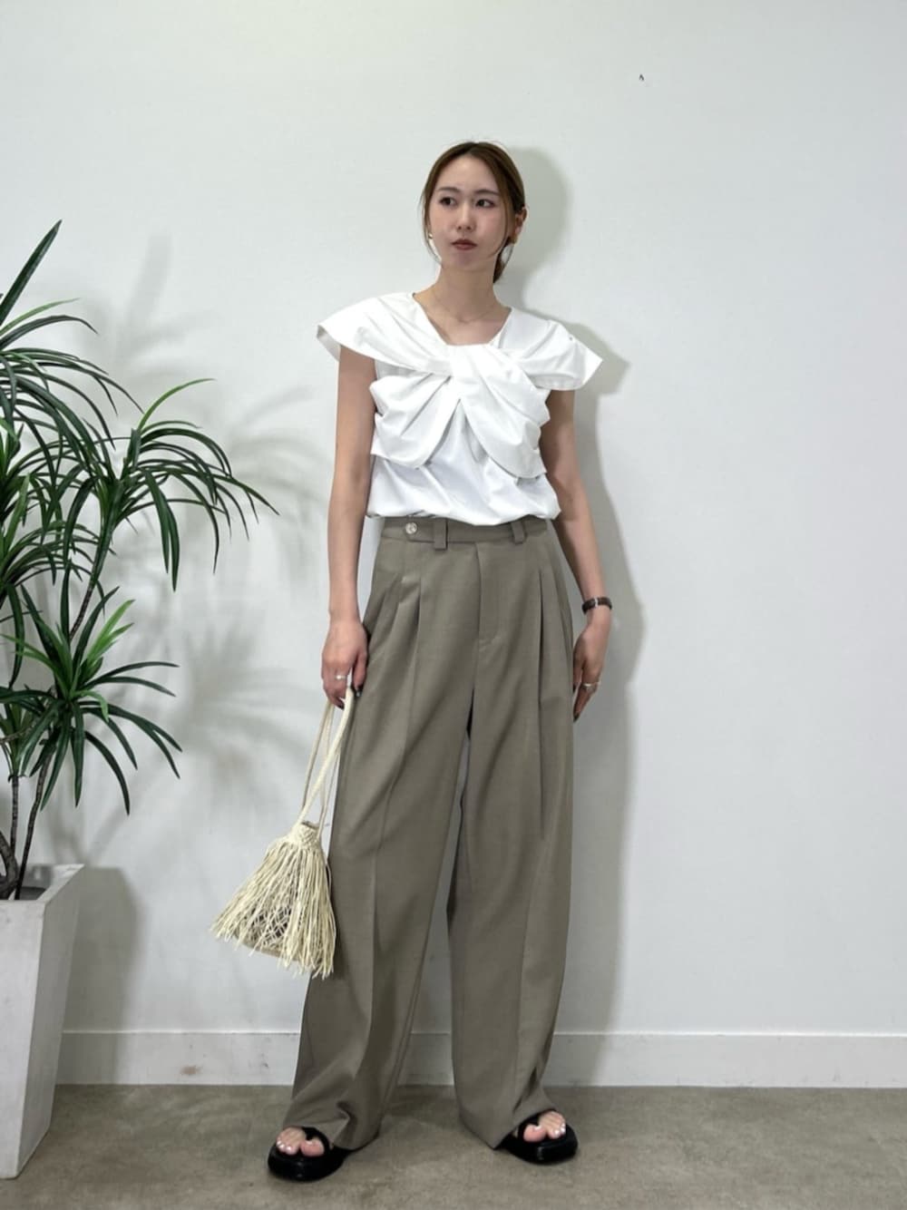 【ブラウス】 胸元のデザインがポイントのブラウス。 生地はパサっとハリのある生地です! 女性らしいデザインですが、甘くなりすぎないように、モードパンツと合わせています◎ 【パンツ】 キレイめにも履けるダブルタックのモードパンツ! ストンと落ちるシルエットがすごくキレイです。 ウエストにボタンがついているので調整可能です。 ずるっと丈を長めに履いていただくのがよりモード感が出ておすすめ◎