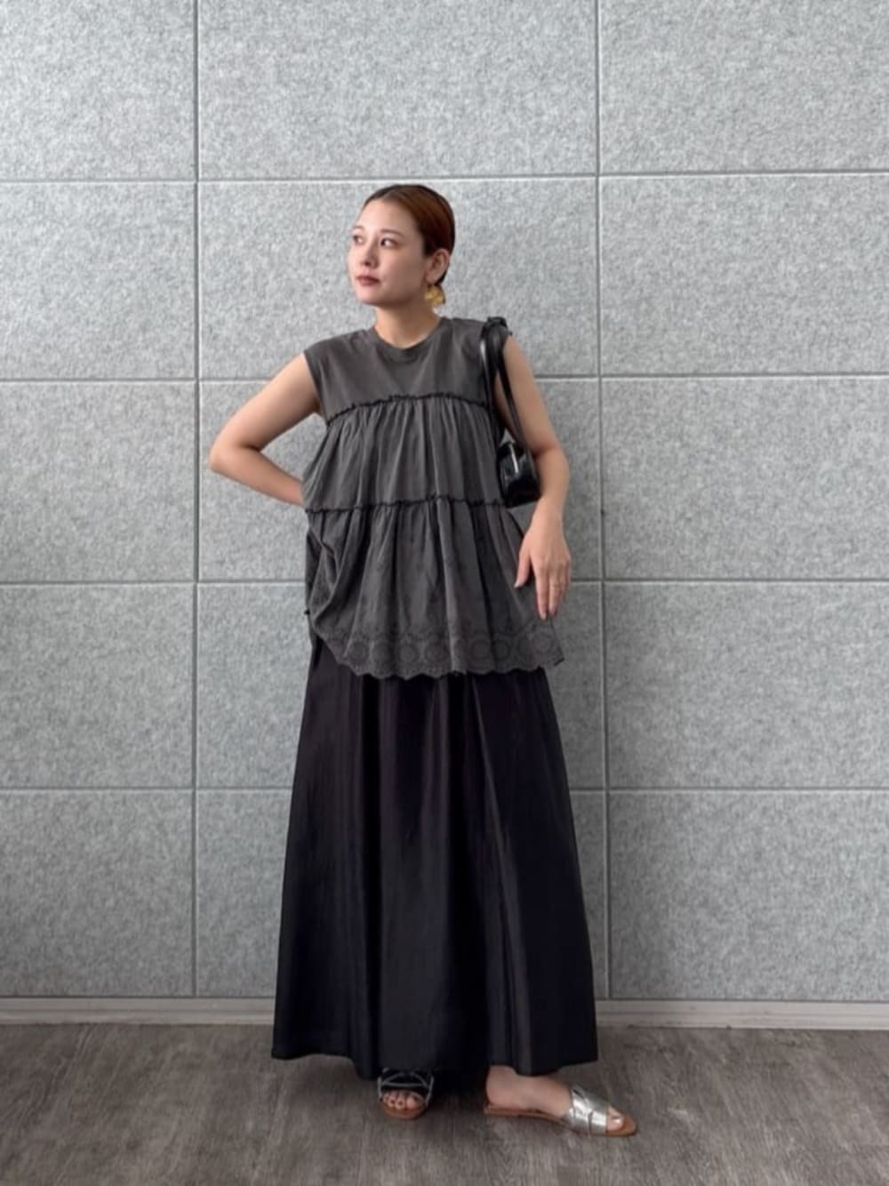 【トップス】 フレアシルエットが綺麗なトップス。 裾のレースデザインがポイントです! さらりとしたコットン素材が心地よく◎。 今回はあえてフレアスカートで合わせレディモードな雰囲気に。 タイトスカートやパンツとの相性も抜群です。 【スカート】 微光沢のシアー素材が目を惹くアイテム。 ウエストにたっぷりギャザーが寄ってきて 歩くとふわっと広がるフレアシルエットがお気に入りです。 Tシャツスニーカーでカジュアルにも、ブラウスミュール合わせでキレイめにも。