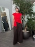 【外部STAFF】 トップス サイドのギャザーデザインが目を惹き、モードカジュアルな雰囲気のトップス。 シンプルながらも個性的なアクセントになってくれます。 パンツ ワイドシルエットでリラックスした印象を与えつつ、全体のバランスを整えてくれています。柔らかな生地感で着心地も良く、動きやすいのが魅力的です。
