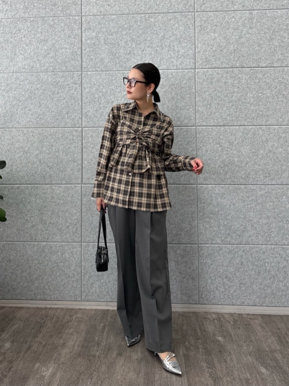 【ビスチェ】 程よいタイト感で着膨れせず◎。 後ろ側はゴム仕様なので着心地がよかったです。 インナーを変えればオールシーズン活躍してくれます! 【シャツ】 絶妙なカラーリングのチェック柄が目を惹きます! 丈が長めなのでアウトスタイルにするとヒップ周りのカバーにも。 【パンツ】 春夏に大人気だったモードパンツが秋冬仕様に。 ウエストの後ろ部分がゴムになりさらに着心地がよくなりました。 美シルエットなワイドパンツで汎用性の高いアイテムです。