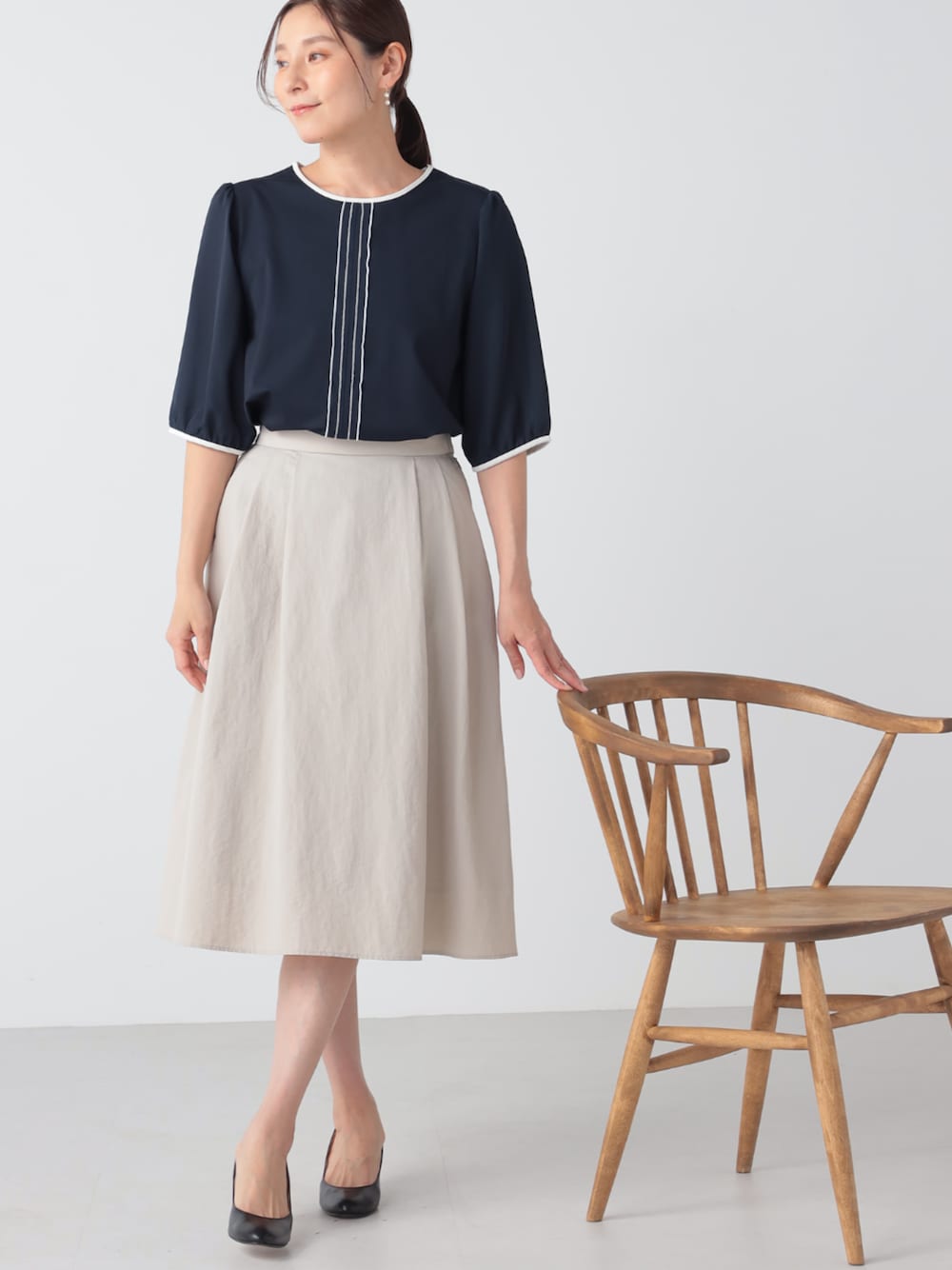 配色ステッチがポイントのプルオーバーは着た瞬間からひんやりと涼しい、接触冷感素材で汗ばむ季節も快適に過ごせます。 さらにUVカット加工で気になる紫外線から肌を守ってくれるのもうれしいポイント。 ツヤ感のあるタックスカートを合わせて上品な雰囲気に。