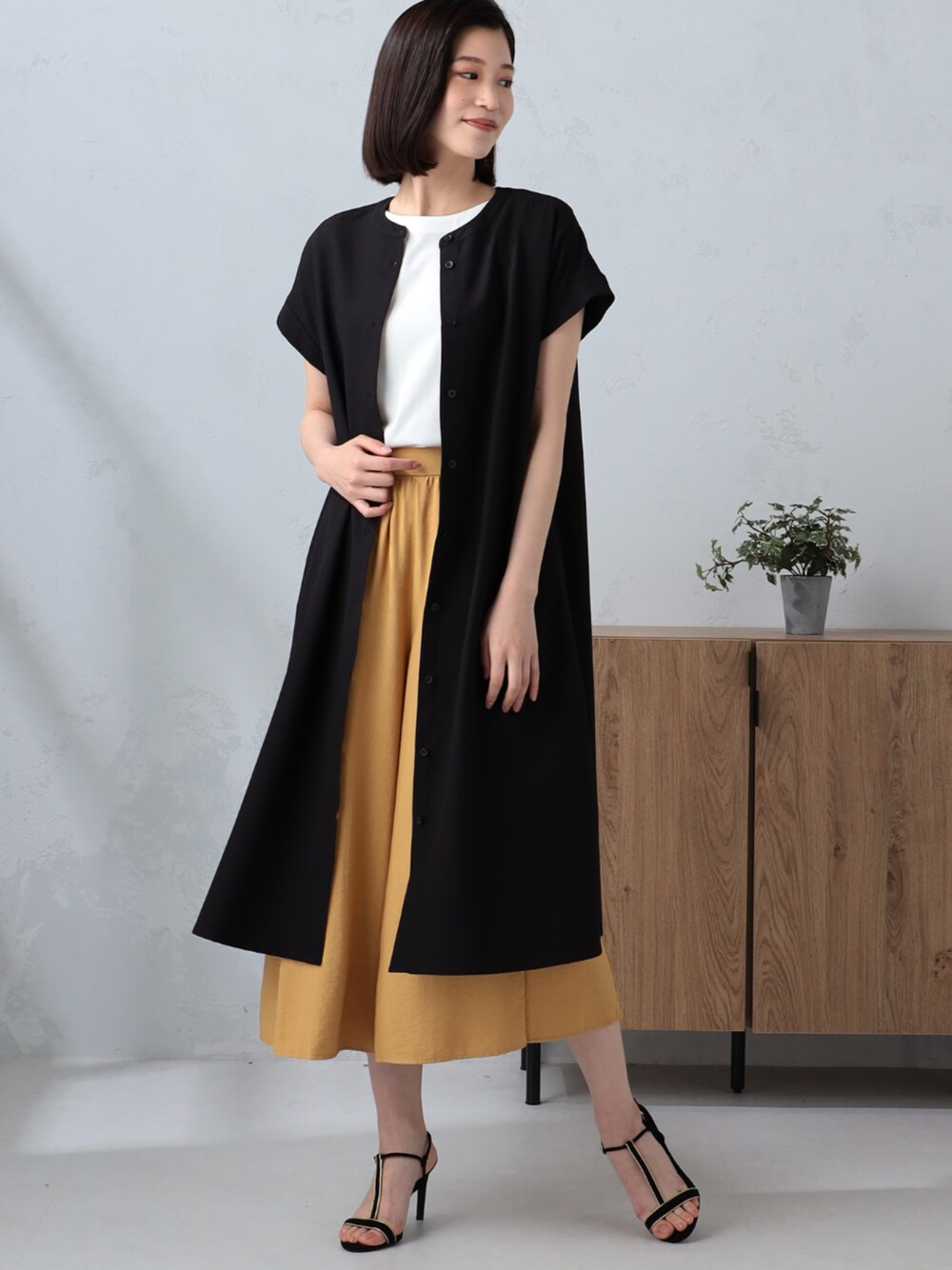 ワンピースを羽織り遣いしたおしゃれなスタイリング。 羽織ったワンピースは凹凸のあるサッカー生地で、肌離れがよく涼しげな着心地。 雨の日やレジャーシーンに便利な撥水加工済みなので、ご旅行やレジャーにも◎ 差し色にマスタードイエローのスカーチョを合わせて華やかさをプラス。