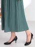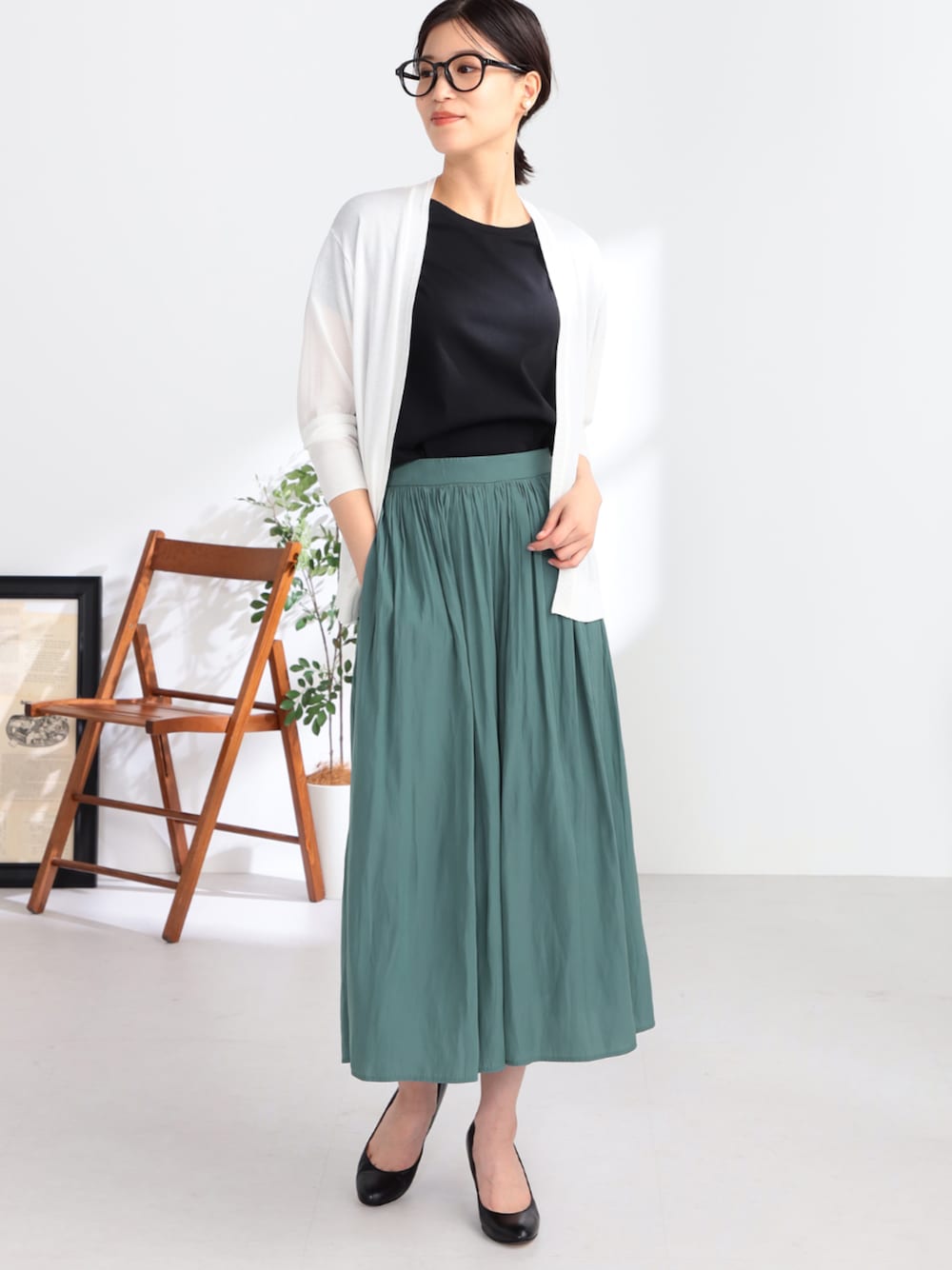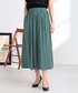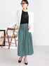 上品な光沢感のあるヴィンテージサテン素材を使用したスカーチョが主役のコーディネート。 深みのあるブルーグリーンのカラーは着るだけでおしゃれに決まります。 繊細なギャザー使いによって、シンプルなカットソーを合わせてもエレガントな着こなしに。 バックウエストはゴム仕様で、リラックスして穿けるのもうれしいポイントです。