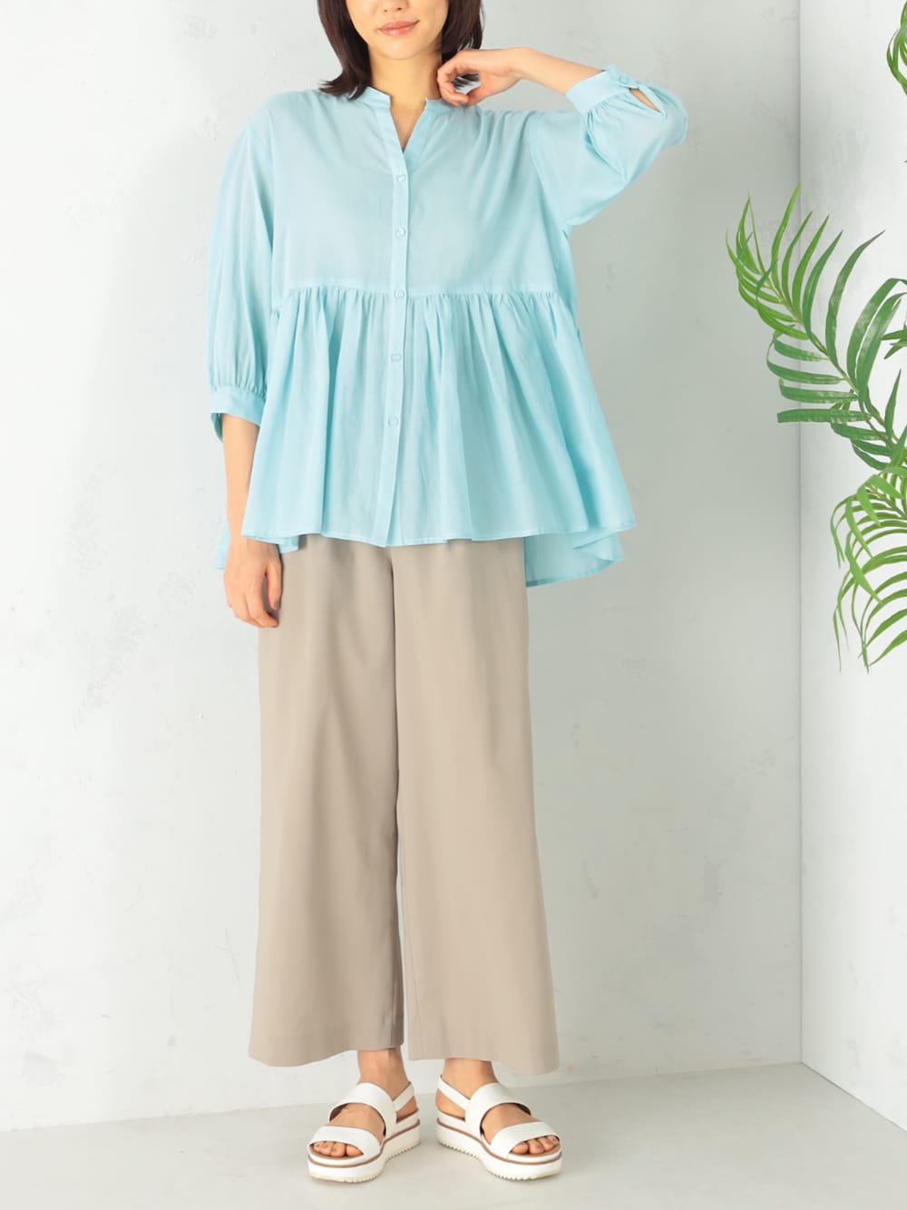 ハイウエスト切り替えの、前開きペプラムブラウス。 首もとに抜け感の出る、スキッパーネックデザインを採用。 気になる腰まわりがカバーできるのも魅力です。 素材には軽やかなローン風生地を使用し、サラッとした肌触りで涼しく着られます。 ワイドパンツ合わせで、今年らしいリラックス感のある着こなしに。