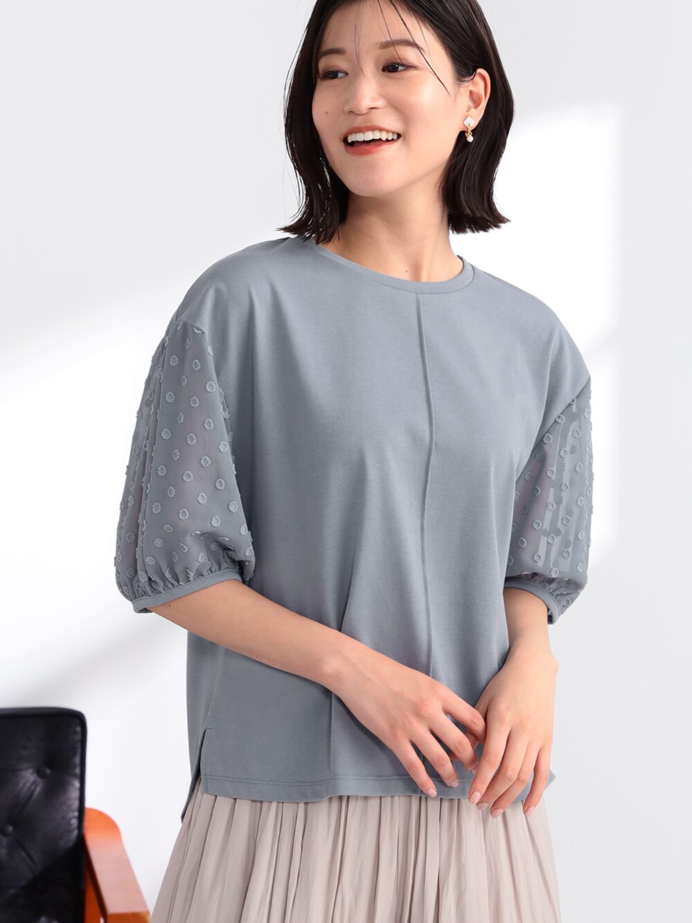 スリーブをシアーなドット柄素材に切り替えたプルオーバー。 ふんわりしたドット柄のスリーブが可愛い一枚。 前身頃の中央に入った切り替えやサイドスリットが、ボディラインをすっきり見せてくれます。 さりげないモード感を楽しみたい日にもおすすめ。 パンツにもスカートにも相性良くスタイリングできます。