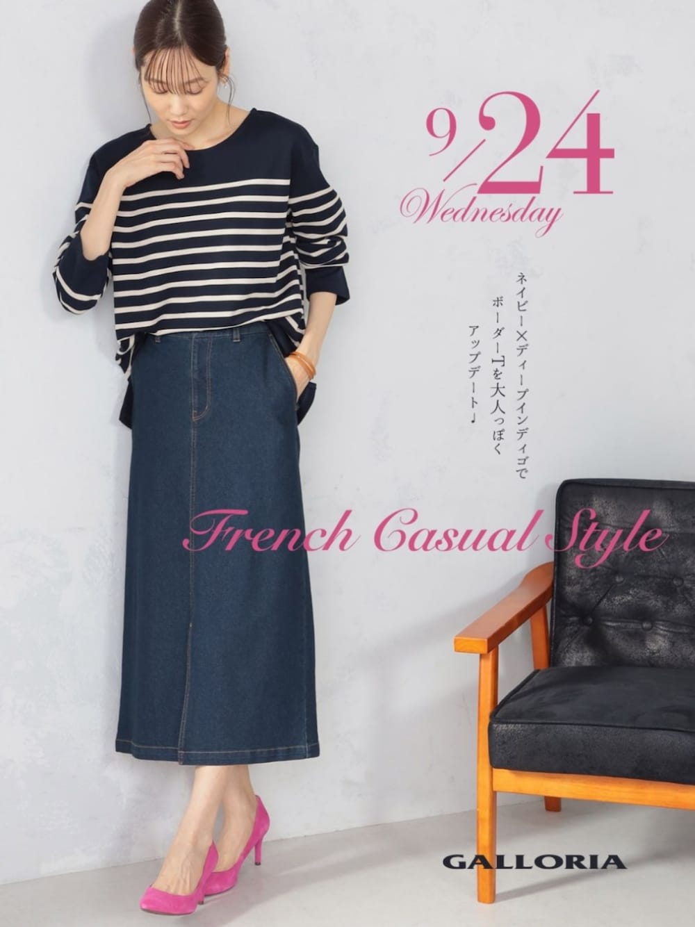 ボーダー×デニムのフレンチカジュアルなコーディネート。 ハリのある生地感のボーダーTは、シルエットにもこだわったアイテム。 鎖骨がギリギリ見える首元の空き具合と裾のスリット仕様で、カジュアルなアイテムながらも抜け感を残した着こなしが可能です。 同系色のデニムでワントーンを作って、シューズのピンクを差し色に。 パリっぽい力の抜けたおしゃれコーデの完成です。
