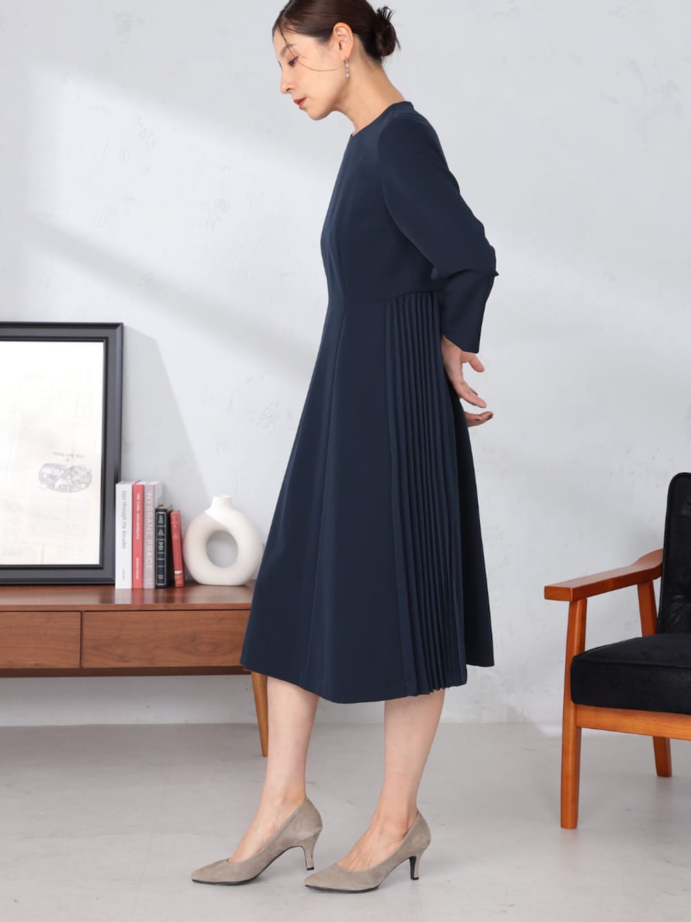 広がりを抑えた大人っぽいAラインシルエットのワンピース。 サイドにあしらったプリーツの切替えが、動きに合わせて華やかな表情を見せてくれます。 お手入れイージー性に優れた、ウォッシャブル仕様。 スムースな生地感が美しく、きちんと感を演出してくれる1枚です。 パーティーなどのオケージョンやセレモニーシーンでのご着用にもおすすめです。
