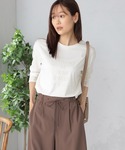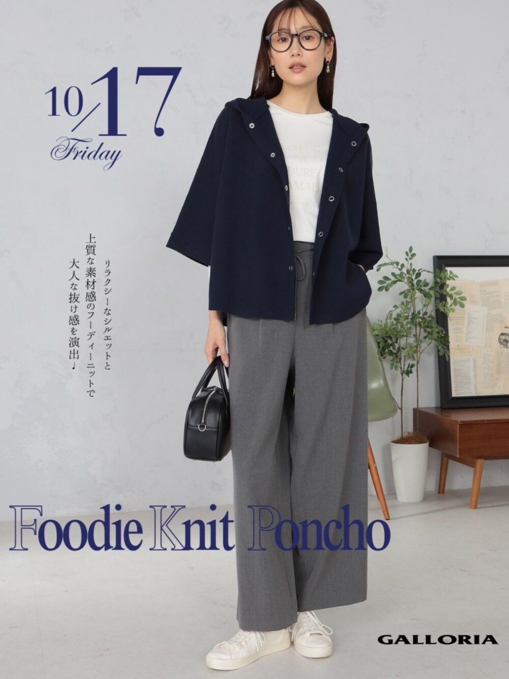抜け感のあるポンチョシルエットのフ―ディーニット。 大人のカジュアルスタイルに最適の一枚です。 お手入れラクチンな抗ピル・マシンウォッシャブル機能つき素材。 厚手のインナーの上にも羽織りやすく、幅広いレイヤードスタイルを楽しめます。 ボトムスはドロスト仕様のワイドパンツでラフな印象に。 ボディラインを拾いにくい適度な厚みと、落ち感のあるとろみ素材の生地を使用したパンツはすっきりとしたラインが美しいデザイン。 カジュアルながらも大人っぽい仕上がりになります。