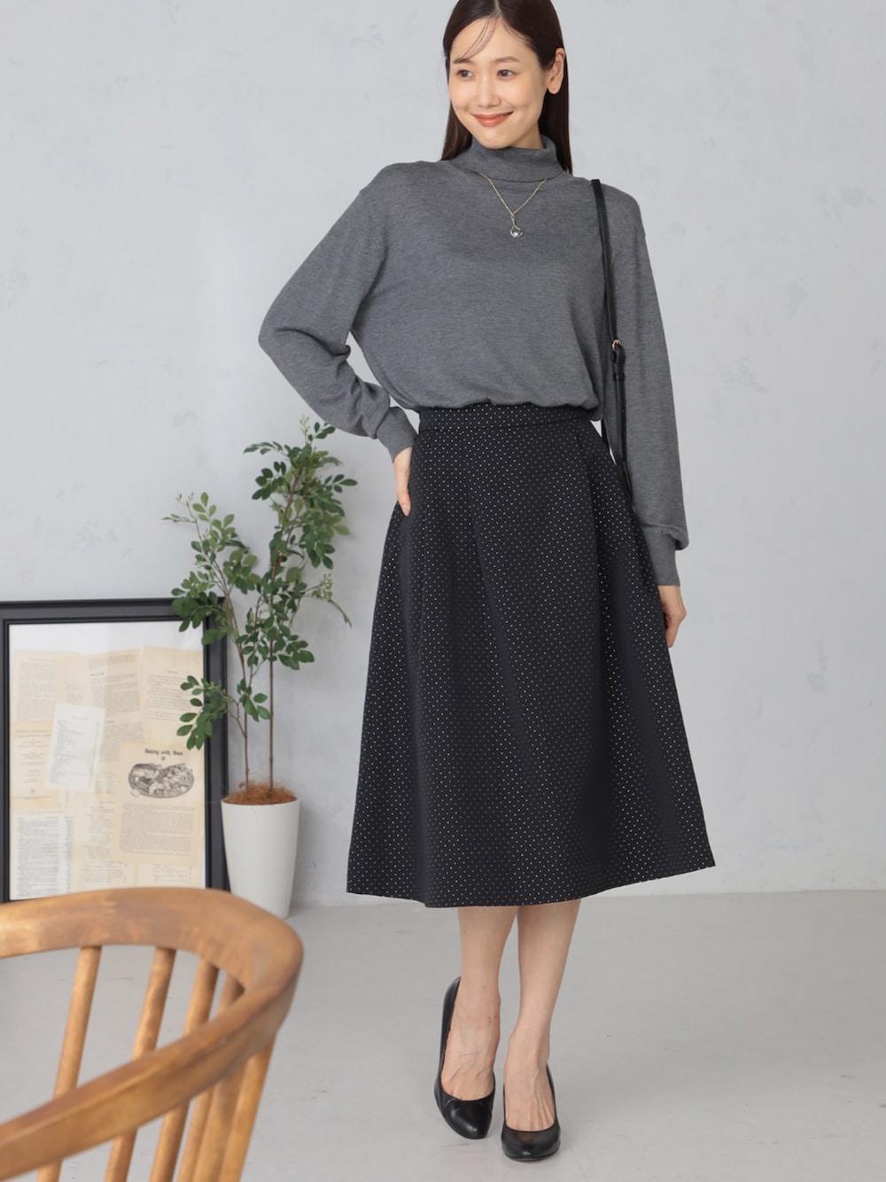お仕事にも着られる、今年トレンドのクラシカルなコーディネートをご紹介。 モノトーンコーデの時は、素材やシルエットで華やかさをプラスするのがポイントです。 ハリ感のある程よい厚みのある生地でふんわりと広がる大人可愛いスカートは、裏地にまとわりつきにくい静電気防止加工の生地を使用し、ウォッシャブル(手洗い)機能をプラスした、機能性にも優れた一枚。 さり気ないドットの折り柄も今年らしいムードを高めてくれます。
