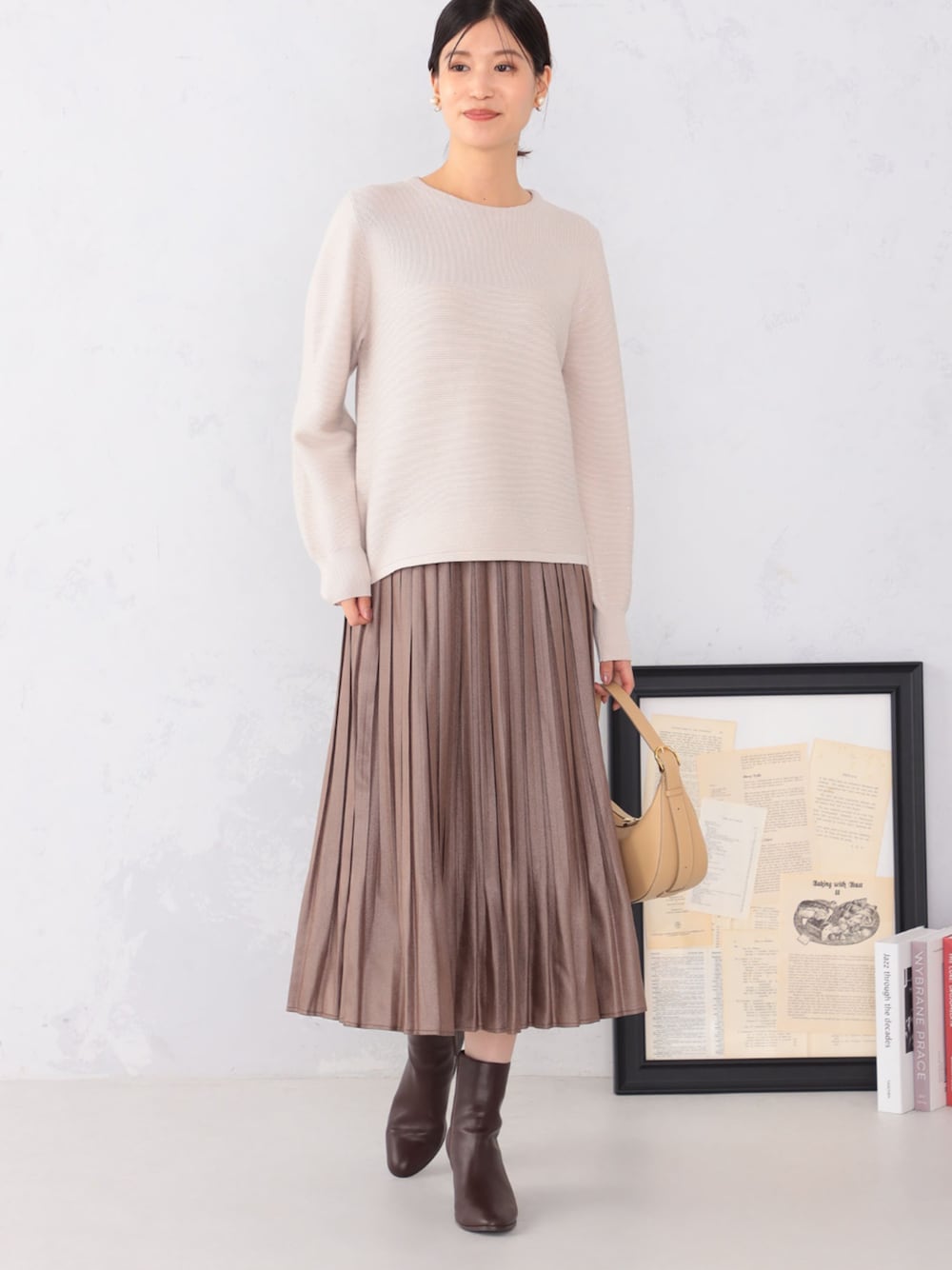 淡色コーデのポイントは素材感にメリハリを出すこと。 ニット×スカートのシンプルなコーディネートですが、トレンド感のある素材を用いることで鮮度のあるコーディネートに仕上げました。 ニットはスパンコールを散りばめた、華やかさのあるアイテム。 種類の違う編み方を組み合わせ、表情のあるシャープな印象に仕上げました。 マットな質感のニットには、艶のあるスカートを合わせてメリハリを。 裾消しプリーツによって軽やかな表情に。 小物もブラウン系でまとめて上品なワントーンコーデに。