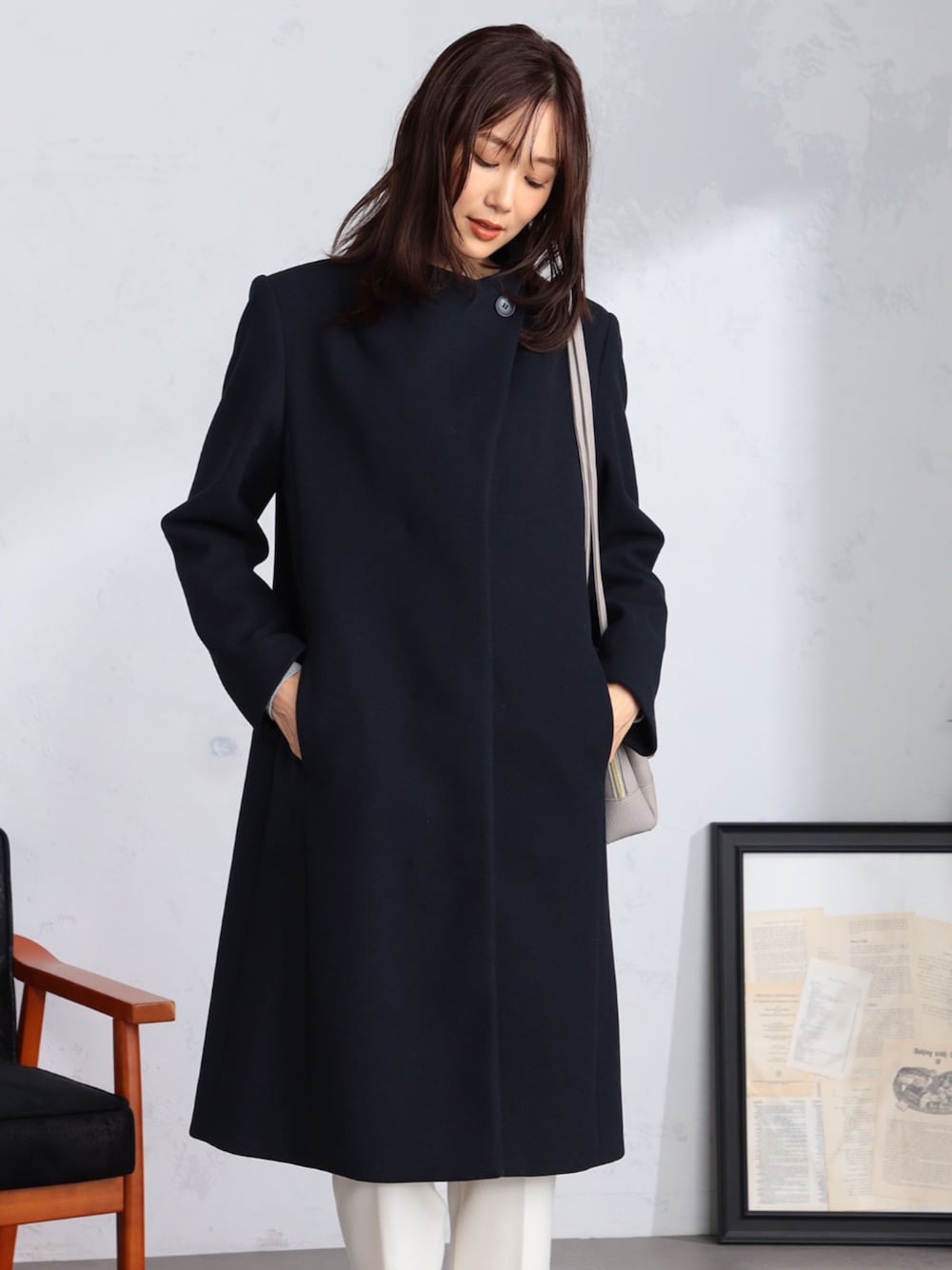 冬の定番アウター、ロングコート。 GALLORIAから今年らしいスタイリッシュなデザインのアイテムが登場しました。 ボトルネックのディテールがこだわりを感じさせるデザイン。 ボタンを隠した比翼仕立てで、フロントがすっきり見えるのが特徴的です。 ボトムスにテーパードパンツを合わせてすっきりとバランスの良いコーディネートに。 ネイビーのコートは暗くなりすぎないよう、インに明るめカラーを合わせるのがおすすめです。 ラメ糸混のニットを選べば顔写りも明るくなること間違えなしです。
