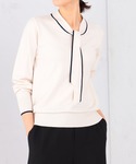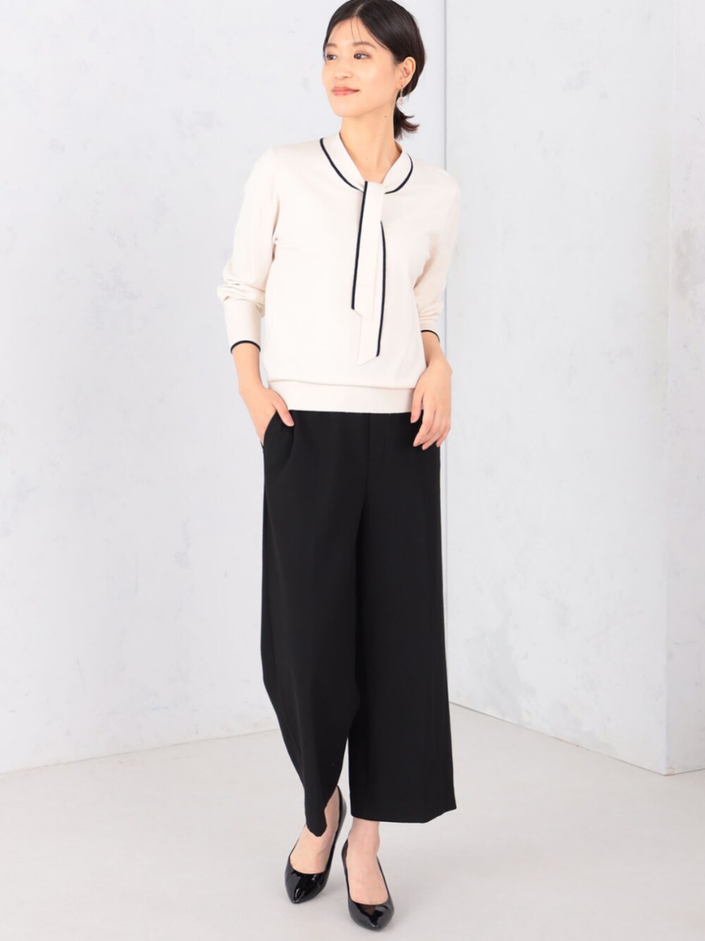 縮んだり型崩れしにくいマシンウォッシャブル加工を生地に施し、ご家庭の洗濯機で洗うことが可能です。 肌触りが滑らかなシアバター加工と、静電気加工によりまとわりつきにくいのも嬉しいポイント。 バイカラーの配色使いがポイントのデザイン。 ボウタイ付きできちんと感がある一枚です。 一枚でサマになる主役級のニットはシンプルなボトムにあわせても着映えします。