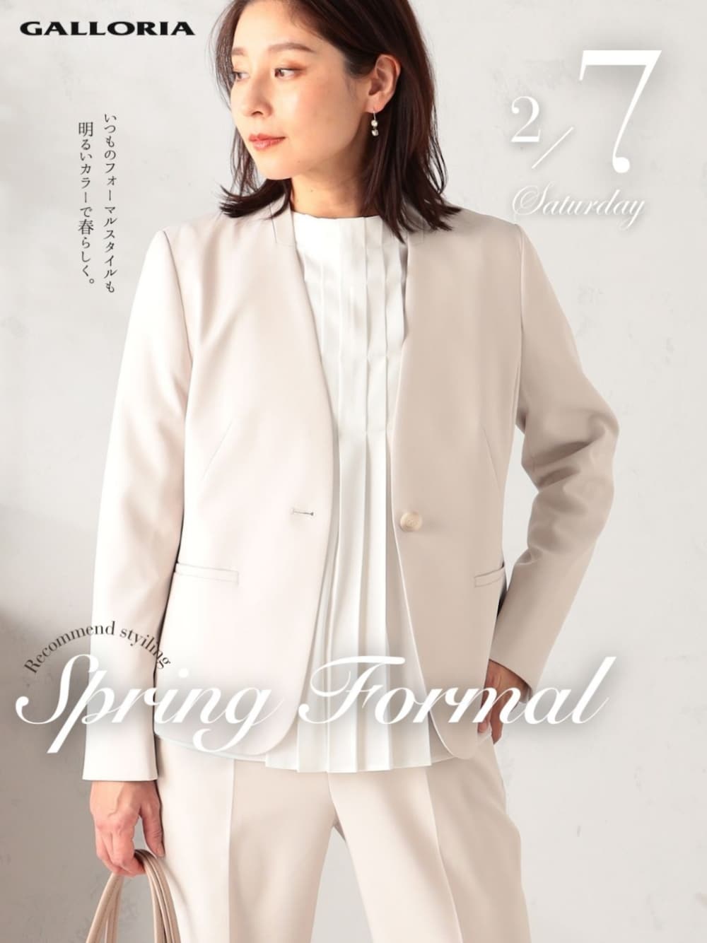 GALLORIA(ギャローリア)公式WEARをご覧いただきありがとうございます。 本日は、大切な節目や特別な一日にふさわしい**「アイボリーのセットアップ」**を主役にしたスタイリングをご紹介します。 重たくなりがちなフォーマルスタイルを、パッと明るいワントーンでまとめることで、春らしい軽快さと清潔感を演出しました。 ■ Point 知的なノーカラージャケット: 首元をスッキリ見せるノーカラーのデザインが、都会的でシャープな印象を叶えます。程よくシェイプされたシルエットは、後ろ姿まで美しく見せてくれるこだわりの設計です。 華やぎを添えるフロントタックブラウス: インナーには、繊細なタックデザインが目を惹くホワイトのブラウスをセレクト。ジャケットのVラインから覗く立体的なラインが、アクセサリーいらずの華やかさを添えてくれます。 凛とした佇まいのセミフレアパンツ: ボトムには、センタープレスの効いた同素材のパンツを合わせて。明るいカラーで繋げることで縦のラインが強調され、スッキリとしたスタイルアップが叶います。 バッグやパンプスも同系色のベージュやニュアンスカラーでまとめて、全体を柔らかなトーンで統一するのが今の気分です。 卒業・入学式などのセレモニーシーンはもちろん、気分を新たに臨みたい大切なビジネスシーンにも。 「凛として、軽やかに」 心まで整うような新しい春の装いを、ぜひGALLORIAで見つけてください。