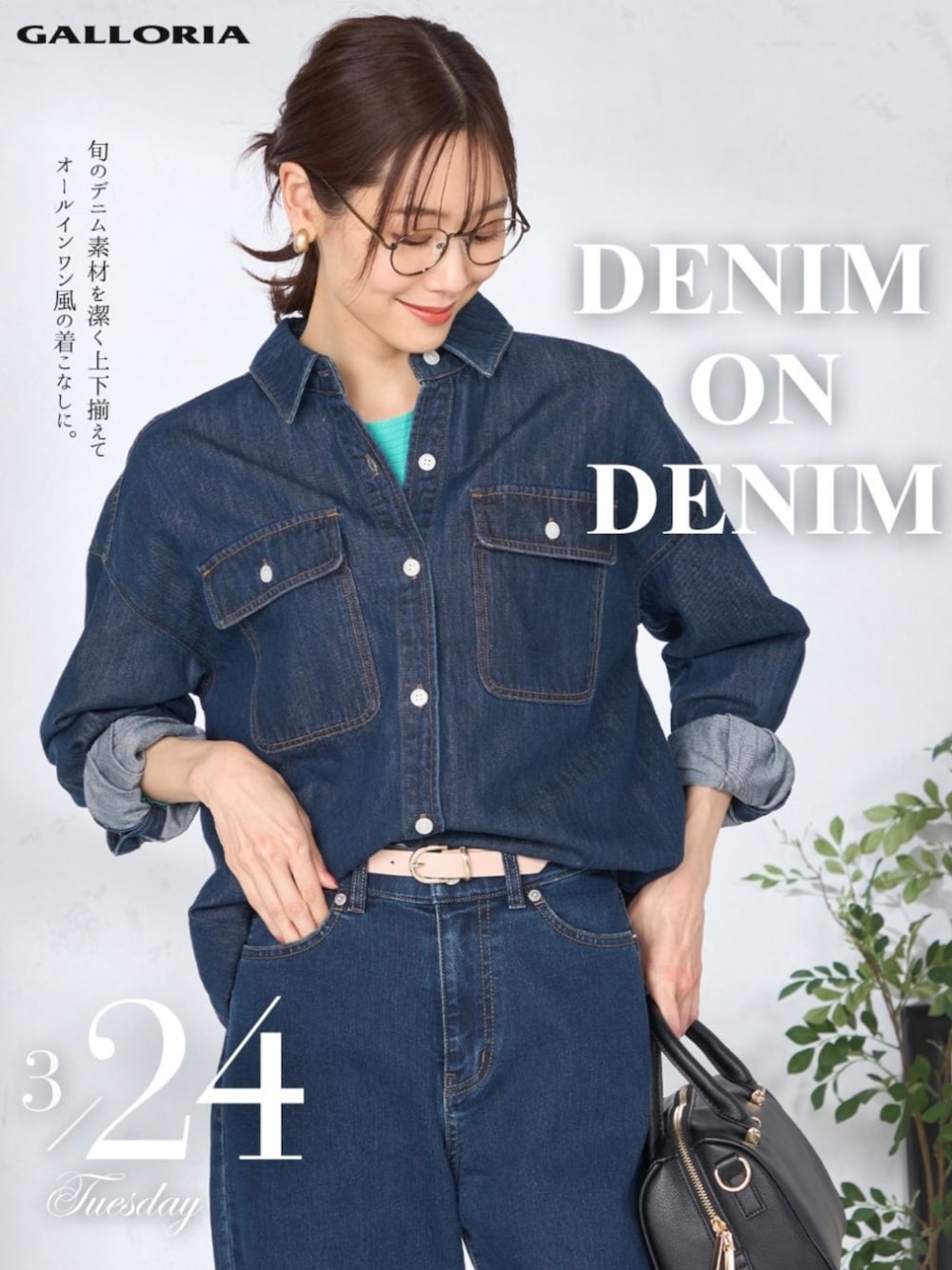 GALLORIA公式WEARをご覧いただきありがとうございます。 本日は、今シーズンのトレンドであるデニム素材を主役にした、スタイリッシュなワントーンスタイルです。 上下のトーンを合わせることで、オールインワンのような一体感が生まれ、カジュアルなデニムをぐっと都会的で知的な印象へと引き上げました。 ■ Point 羽織りとしても主役級のデニムシャツ:落ち着きのあるネイビーが魅力のシャツは、身体を泳がせるようなリラクシーなサイズ感が特徴です。胸元のダブルポケットが視線を上げ、凛とした佇まいを演出します。インナーに鮮やかなグリーンを覗かせ、袖を軽く捲ることで、春らしい抜け感のある表情に仕上げました。 美シルエットを叶えるワイドデニムパンツ:ボトムには、すとんと落ちるラインが美しい同素材のワイドデニムをセレクト。腰回りはスッキリと見せつつ、程よいボリューム感があるため、シャツをフロントインするだけでしなやかなメリハリが生まれます。 洗練度を高める小物使い:ウエストには肌馴染みの良いベージュのベルトを添えて、ワントーンの装いにさりげないアクセントをプラスしました。足元には深みのあるボルドーのフラットシューズを合わせ、大人の品格を保ったカラーバランスに整えるのがGALLORIAスタッフ流の着こなしです。 週末のショッピングや春のお出かけなど、自分らしく軽やかな足取りで過ごしたい日の装いにいかがでしょうか。 凛として、しなやかに。 働く女性の毎日をより豊かに、美しくアップデートしてくれるGALLORIAの春の新作をぜひチェックしてください。