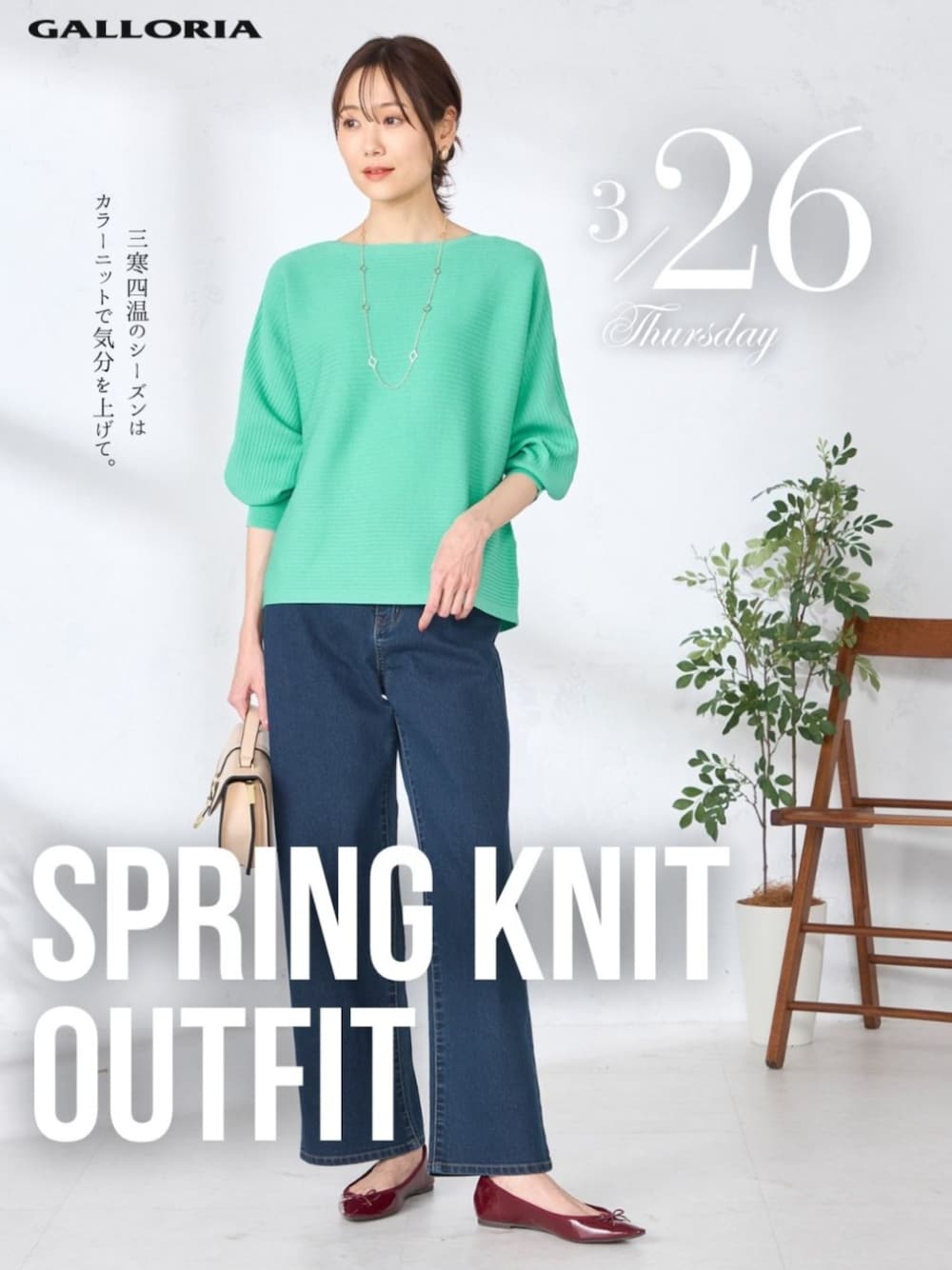 GALLORIA公式WEARをご覧いただきありがとうございます。 本日は、春の瑞々しい空気感を纏ったクリアグリーンのニットを主役に、都会的なネイビーのワイドデニムを合わせた、凛として柔らかなコーディネートをご紹介します。 全体を明るいグリーンと落ち着いたネイビーのコントラストでまとめることで、春らしい清涼感と知的なムードを両立させたスタイリングです。 ■ Point 表情豊かなガーター編みドルマンニット:横方向の編み地がこなれた印象を与えるクリアグリーンのニットは、身体を優しく包み込むドルマンスリーブが魅力です。スッキリとしたボートネックが顔周りに凛とした知性を添え、手首を覗かせるリブ使いが女性らしい華奢なラインを引き立ててくれます。 リラクシーなワイドデニムの抜け感:ボトムには、すとんと落ちるラインが美しいネイビーのワイドデニムをセレクト。程よいボリューム感のあるシルエットが、華やかなドルマンニットと相まって、大人の余裕を感じさせるしなやかな佇まいへと導きます。 彩りを添える差し色使い:手元には肌馴染みの良いベージュのハンドバッグを合わせ、足元には深みのあるボルドーのバレエシューズをセレクトしました。落ち着いた配色の装いに彩りを添えるのがGALLORIAスタッフ流の着こなしです。 週末の美術館巡りや春の街歩きなど、自分らしく彩りを楽しみながら、心地よく過ごしたい日の装いにいかがでしょうか。 凛として、しなやかに。 働く女性の日常をより豊かに、美しくアップデートしてくれるGALLORIAの春の新作をぜひチェックしてください。