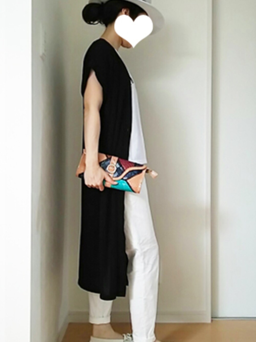 ハット: curvy's in SHOPLIST.com (ショップリスト) ロングカーデ:GU(ジーユー) Tシャツ:GU(ジーユー) パンツ:GLOBAL WORK(グローバルワーク) モカシンシューズ:POMPADOUR(ポンパドール)in 「MUSE&Co.」 クラッチバッグ:セブ島の民族店