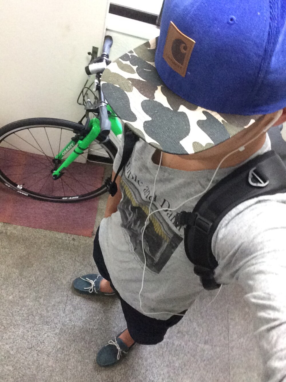 先月の写真ですね。 このキャップやすかったんですよ、3000円したかしなかったか、 この日は肌寒かったので長袖にしました。 後ろは新しくなった自転車くんです。 かわいがります。