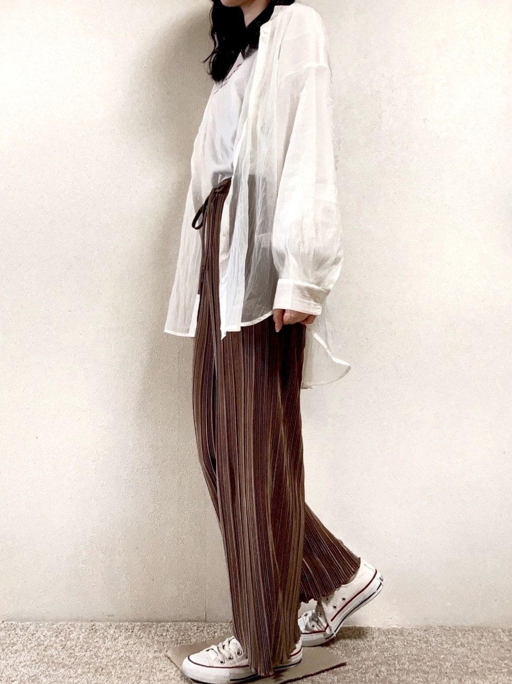 . . . ちょっとお散歩👣 GUのらくちんシンプルコーデ⚪️🟤 シアーシャツの中ロンT着たけど 夏とかはタンクトップ着たいなぁ💭💭 GUのシアーロングシャツ👔 去年はグリーン買ったけど今回は白!! 羽織ってもいいし中に着てもいいし重宝の予感しかしない👀✨ ともだちもピンク買ってました👏🏻 これもGUのランダムプリーツドローストリングパンツ👖 ウエストがゴムでとにかく楽🌱 ほんでもってスタイルよく見える👏🏻 個人的に裾が可愛くて好きです🌸 求めてたブラウンでした🧸🧦 春服夏服って冬服に比べて1枚1枚安いから めっちゃ枚数買っちゃって収納足らんくなる(笑) ピアノ🎹を手放して収納つくるか親と相談中… ロング丈続いてるから次ミニ丈にしよかな💭💭