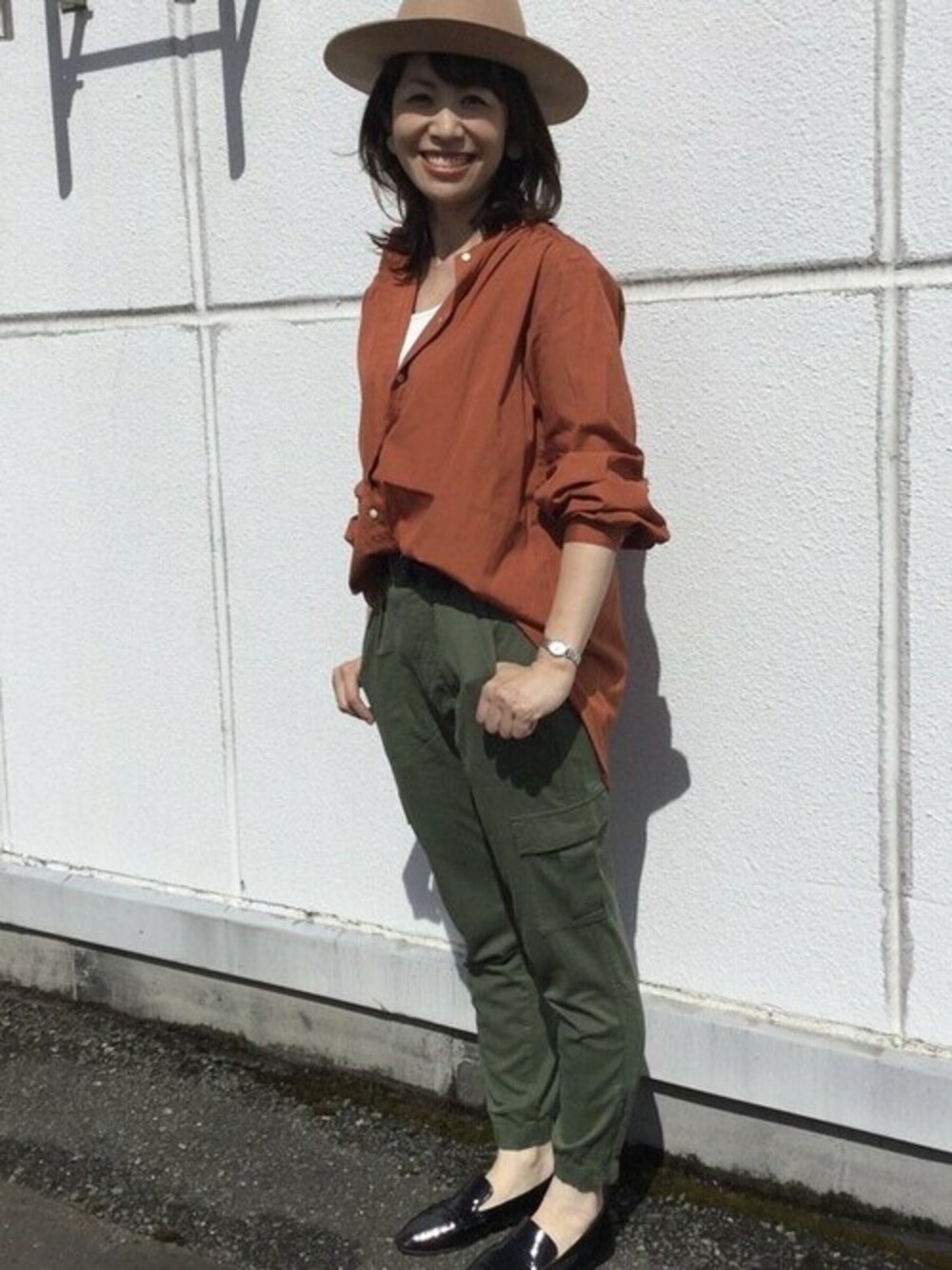 今から着れる素材の秋色コーデ♪ トレンドのテラコッタカラーにオリーブのボトムスを合わせ抜き襟でぬけ感を出しています。 テラコッタはデニムとも相性がいいのでコーデのバリエーションが幅広いです。 【Gapストア 国分寺マルイ店/Fukuyama】