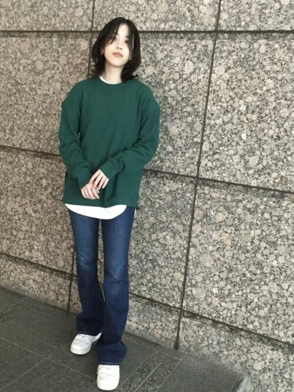ラウンドカットのヘビーウェイトTにメンズのワッフルTを重ね着。 ゆったりtopsにフレアデニムでトレンド感◎ 【Gapストア 熊本鶴屋店 / Sonoda】
