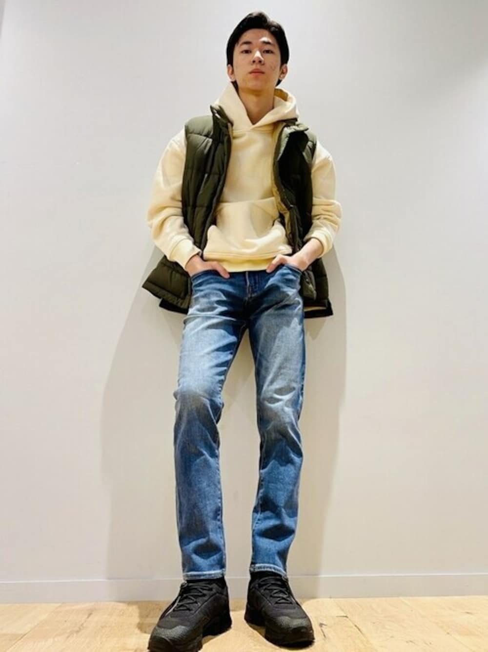GAPの定番スタイルに仲間入りした、Slim Taper デニム!SOFTWEARシリーズなので、生地も柔らかくとっても履きやすいので大変人気です! 膝下から裾に向かって細くなるテーパード仕様は太ももがゆったりしているので、細みのパンツが履きたいけど太ももが、、、なんてお悩みの方におすすめします! パーカーに、ダウンベストのスタイルも色を抑えたコーディネートにするとカジュアルで親しみやすい印象に! 【Gapストア 新宿フラッグス店 / Futa】