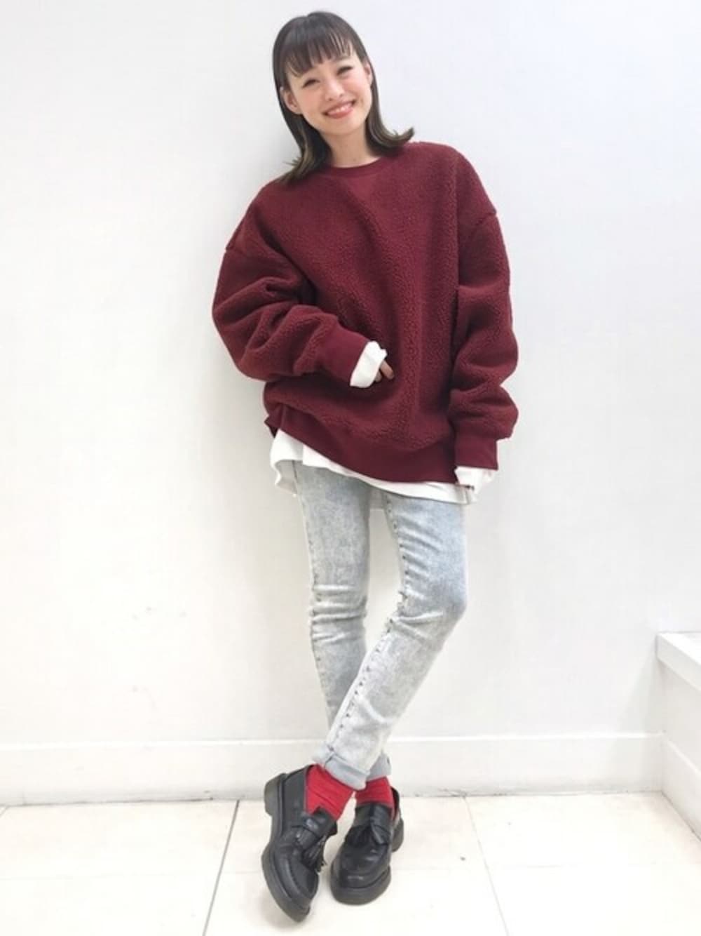 ALL メンズアイテムでもサイズや色選びで女性らしさを演出! 寒くなってきた今、フルレングスデニムをお探しの方が増えてきました。女性の方にもメンズデニムがオススメです。 なかでもスーパースキニーのこのスタイルは、ウォッシュ感が目を惹き、試着率も高いです。穿いた皆様が柔らかさと、ライトウォッシュでも立体感が出るカラーに驚かれます。 ダークカラーになりがちな冬のトップスへの色合わせとしてもオススメです! 大人気の、ふわもこボアスウェット!バーガンディカラーを選んで見た目も暖かく♪ 見た目以上の軽さも人気のひとつです! インナーのロンTは、やわらかワッフル地!生地も厚すぎず、腕周りや胴回りもやや細めなので、トレンドのレイヤリングコーデのインナーにもピッタリです! 【Gapストア 丸井錦糸町店 / Akane】