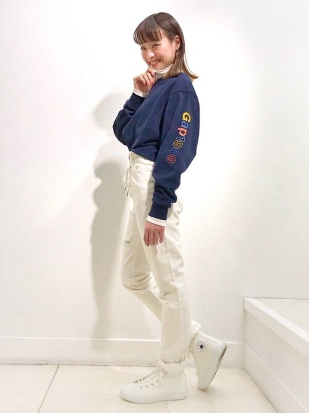 カラフルなサイドロゴが目を惹くロゴスウェットは、従来のスウェットの厚さよりはTシャツに近い軽さ! 丈はやや短めなのでお手持ちのTシャツなどとレイヤリングがおすすめです。 胴回りはたっぷり、袖周りはスッキリ!トレンドのゆるシルエットにもメリハリがつき女性らしさを魅せられます。 ショート丈トップスには、ウエストにポイントのあるハイウエストのデニムを合わせ、より脚長効果を♬ ストレートに近いボーイフレンドデニムは、膝下にかけややテーパードなのでロールアップしやすく、どんな身長の方にも穿きこなせます! 柔らかめな生地感で、お尻周りをしっかり包み込んでくれ穿き心地もgood! 【Gapストア 丸井錦糸町店 / Akane】