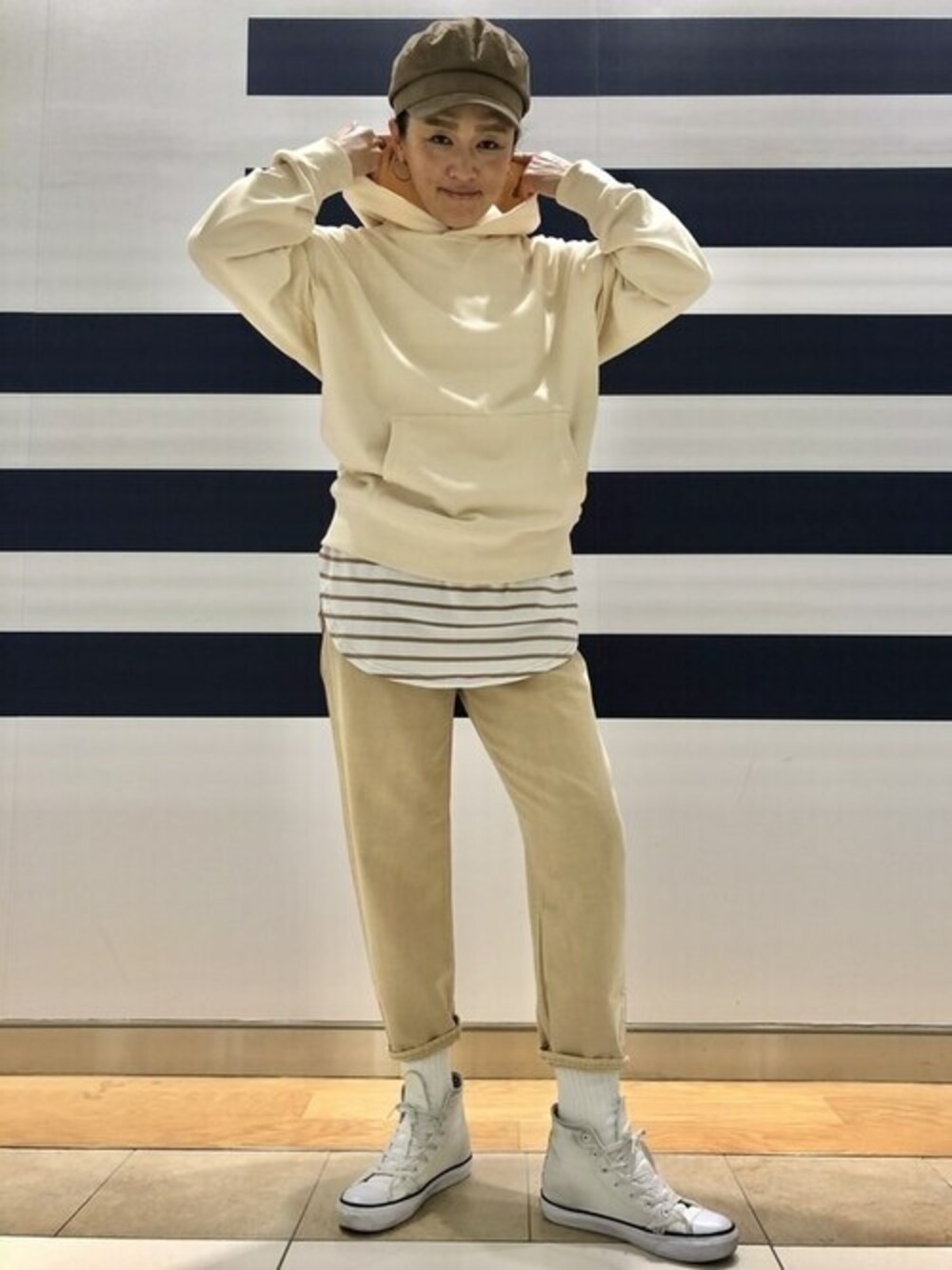柔らかい優しい印象になる『ホワイト✖️ベージュ』の組み合わせは、春のオススメカラーリングです。 ユニセックスで着られるパーカーは、フレンチテリー素材なのでこれから温かくなる季節にちょうど良い生地質。厚すぎず柔らかい生地感が最高です! ハイライズのバレルジーンズは、柔らかい生地質でゆったりしたシルエットなので、お尻周りや脚線を拾わずリラックスしてお穿きいただけます。 【Gapストア グランツリー武蔵小杉店 / Endo】
