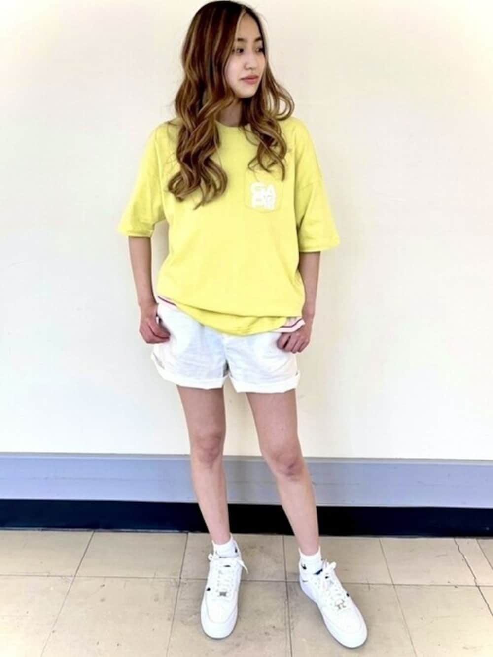 【Tシャツ×ショーツ】ユニセックスで着られるロゴTのご紹介です。 バックプリントのインパクトが目を引くSOFT FINISH Tシャツです☆ 柔らかい生地感と、程よいゆとりのあるシルエットが、ロゴのデザインをさらに引き立たせてくれます。 アクティブ感満載のカラーのトップスは、軽快さを活かして、ボトムスも軽やかな物がおすすめです。 丈を短めに折り返して、レイヤードで差し色やデザインを加えると、一層存在感のあるコーディネートに仕上がります。 今回はスニーカー着用ですが、サンダルと合わせても夏らしくて素敵だと思います☆ 【Gapストア 上野マルイ店 / ruruka】
