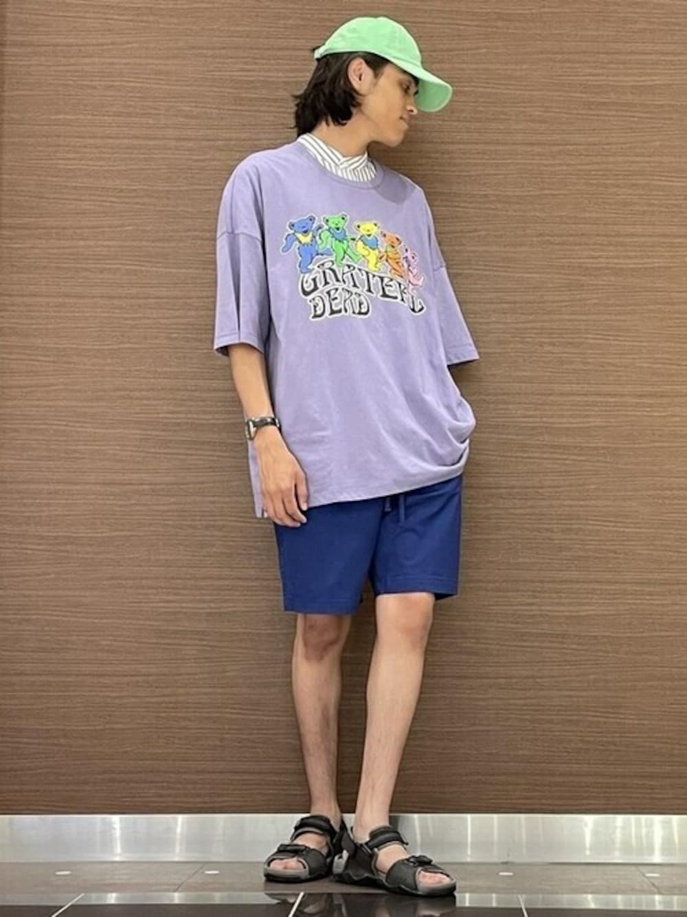 175cm 伝説的ロックバンドグレイトフル・デッドのカラーTシャツコーデのご紹介です。 くすみカラーにPOPなネオンカラーのダンシング・ベアが映える今回の一枚は思いっきりカラフルに! サイズはいつもより2サイズupでアクティブ感を出せるようにしました♪ 【Gap / Nagata】