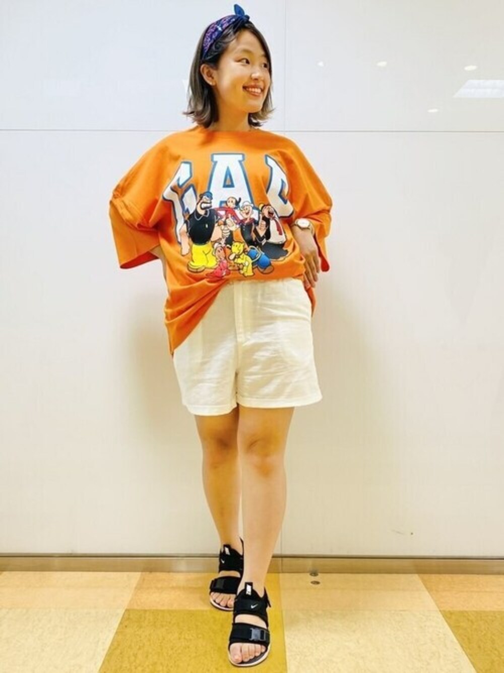 159cm BIGプリントが可愛い、ポパイTシャツが入荷しました! リンクコーデできます‼︎ 肩が落ちてるタイプの形なのでゆったり着て、涼感を出し、スポーティー、楽、を追求したコーディネートです。 インせずワンピース風に着ても可愛いです! 【Gapストア 京急上大岡店 / Ohata】