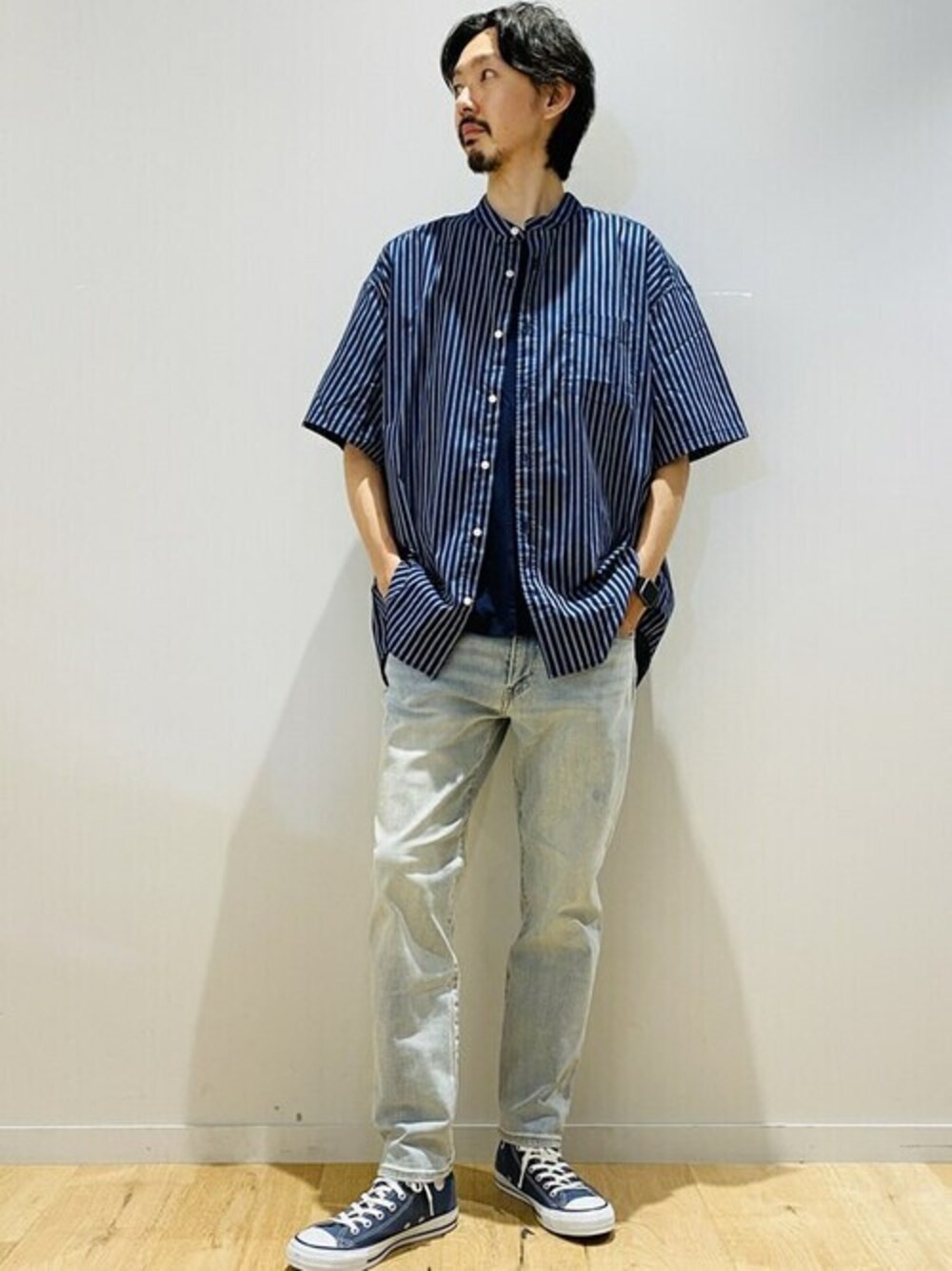 178cm 【デニムスタイル】をクリーンな印象にコーディネート! オーバーサイズシャツにアンクル丈のデニムな着こなしです! 全体をクリーンな印象にまとめました! アンクル丈のデニムは、どんなシューズとも相性良く、更にスッキリとした印象で着こなせます! ぜひ、チャレンジしてみて下さい! 【Gapストア 新宿フラッグス店 / Wada】