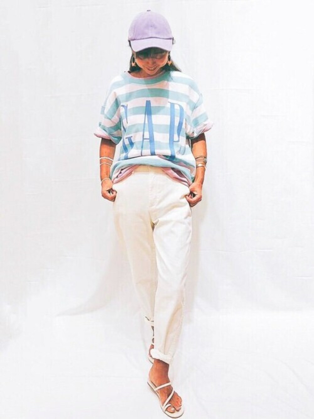 153cm 休日リラックスコーデのご紹介です! 柔らかいジャージニットのドロップショルダーの半袖Tシャツはロゴがポイント! ゆとりのあるシルエットのバレルカーキを合わせて、休日のおしゃれも楽しくなりそう! 【Gapストア ららぽーと海老名店 / Miyake】