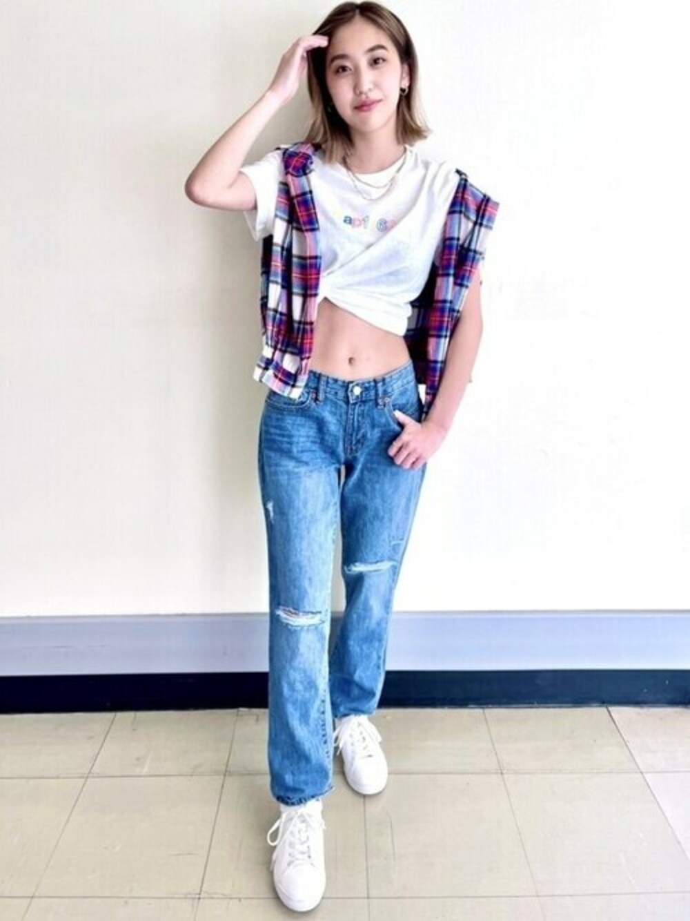 157cm 今回はデニムとチェックシャツを使用した、ザ・アメカジコーディネートです! トップスには軽い素材が特徴のTシャツをチョイス。 胸元のロゴはさりげないので、どんなアイテムとも相性がいいです。 元々丈は短めですが、今回は裾を結んで肌見せをすることでよりヘルシーで元気な印象にしてみました! ボトムスはセクシーボーイフレンドデニムを着用しています。 ノンストレッチでしっかりとしたデニムの生地感ですが、とても軽く今の時期でも楽に履いていただけます。 ワンポイントにチェックシャツを肩に掛けることでアメカジ感をプラスしました! 夏もGAPのアメカジスタイルを楽しみましょう〜! 【Gapストア 上野マルイ店 / ruruka】