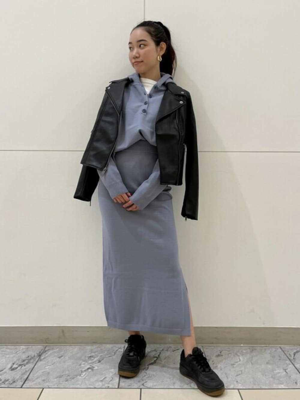 160cm 肌触り抜群のニット素材のフードとスカートを合わせたコーディネートです。 お出掛けにもおうち着としても着て頂けるセットアップです。 くすみブルーカラーは今秋のマストカラーアイテムです。 ライダースを合わせる事でカッコ良さをプラスしてみました。 フードとスカートを別々に他のアイテムと合わせて着ても秋先取りコーデなりららに、着回しが効きますよ。 同じ素材で、スタイル違いや色違いもございます。 パンツスタイル、スカートスタイルを楽しんで下さい。 【Gapストア イオンモール高崎店 / Aikawa】