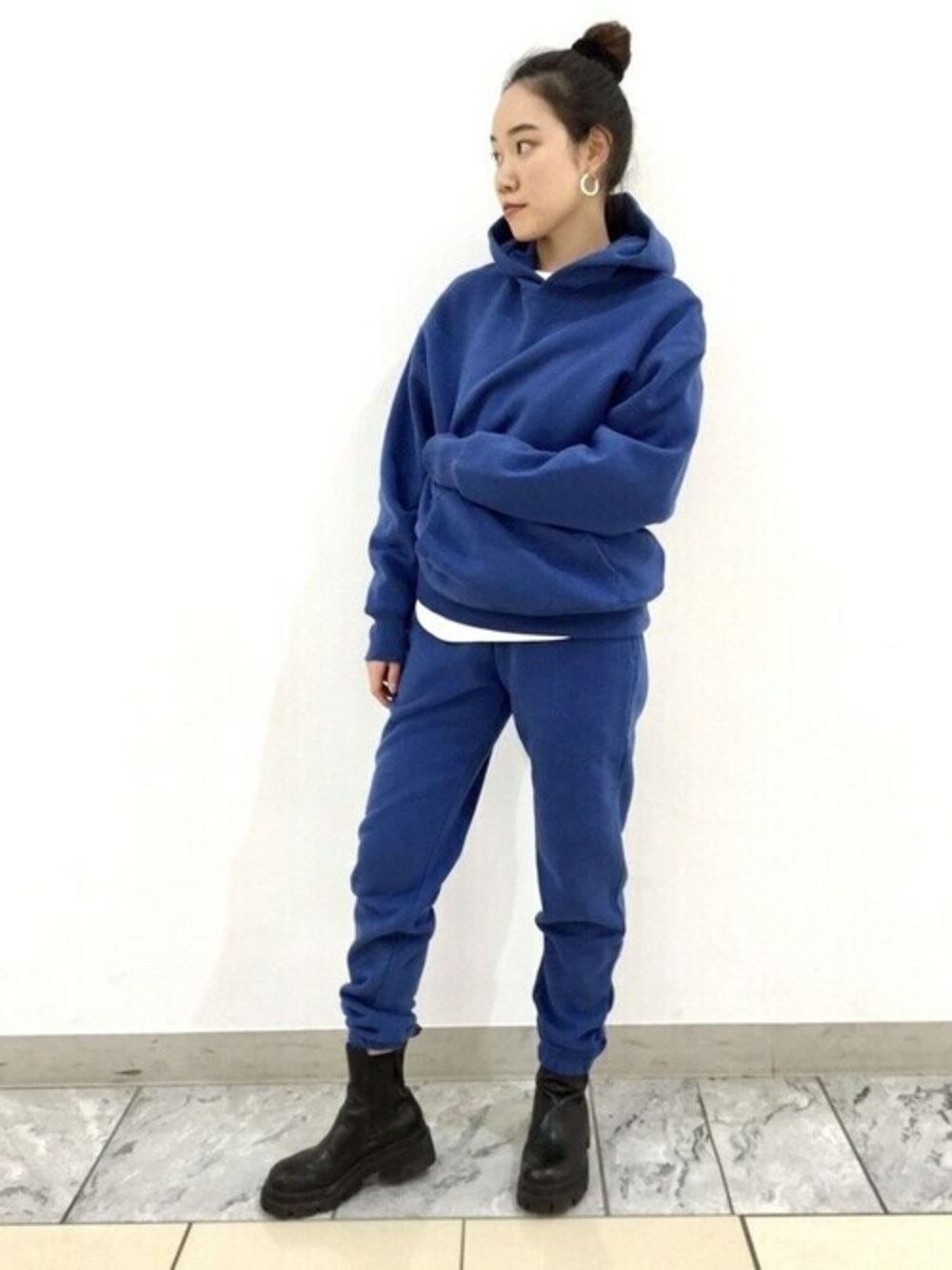 161cm スウェットセットアップコーデです。 オ-バサイズで手が隠れるくらいの緩い感じで着こなします。 スウェットの生地感の厚みも女性が着るとふんわりして可愛らしくなります☆ インナーのTシャツを裾からのぞかせアクセントにしています。 顔にかかるフードが小顔効果! 靴やヘアで「カッコよさ×サイズ感は緩め」にまとめました! 【Gapストア イオンモール高崎店 / Ito】